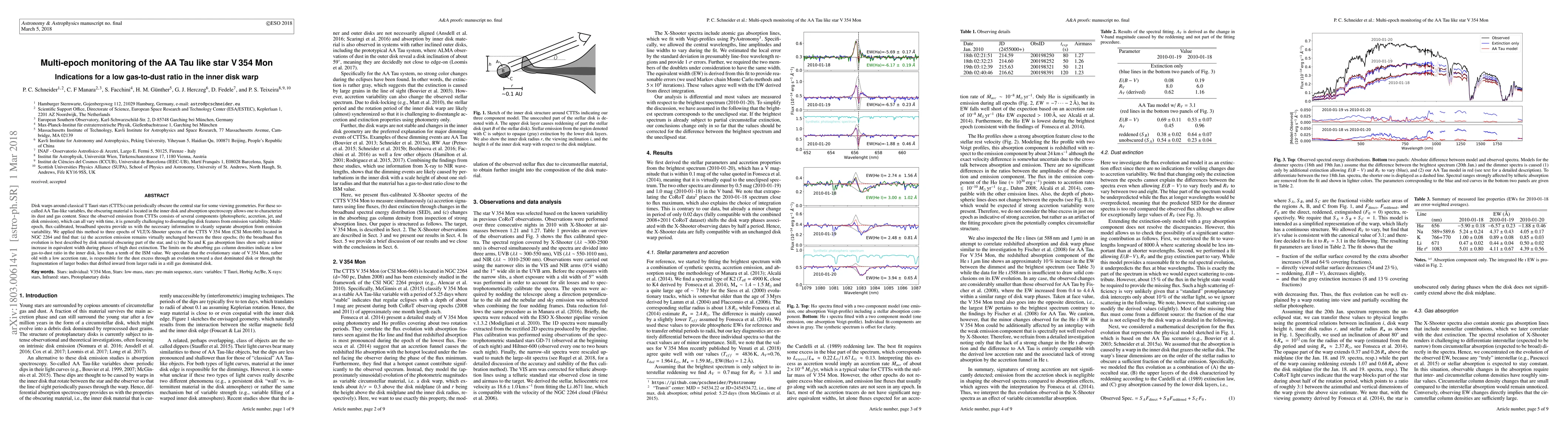 Disk warps around classical T Tauri stars (CTTS) can periodically obscure the central star for some viewing geometries. For these so-called AA Tau-like variables, the obscuring material is located in the inner disk and absorption spectroscopy allows one to characterize its dust and gas content. Since the observed emission from CTTS consists of several components (photospheric, accretion, jet, and disk emission), which can all vary with time, it is generally challenging to disentangling disk features from emission variability. Multi-epoch, flux-calibrated, broadband spectra provide us with the necessary information to cleanly separate absorption from emission variability. We applied this method to three epochs of VLT/X-Shooter spectra of the CTTS V354 Mon (CSI Mon-660) located in NGC 2264 and find that: (a) the accretion emission remains virtually unchanged between the three epochs; (b) the broadband flux evolution is best described by disk material obscuring part of the star, and (c) the Na and K gas absorption lines show only a minor increase in equivalent width during phases of high dust extinction. The limits on the absorbing gas column densities indicate a low gas-to-dust ratio in the inner disk, less than a tenth of the ISM value. We speculate that the evolutionary state of V354 Mon, rather old with a low accretion rate, is responsible for the dust excess through an evolution toward a dust dominated disk or through the fragmentation of larger bodies that drifted inward from larger radii in a still gas dominated disk.