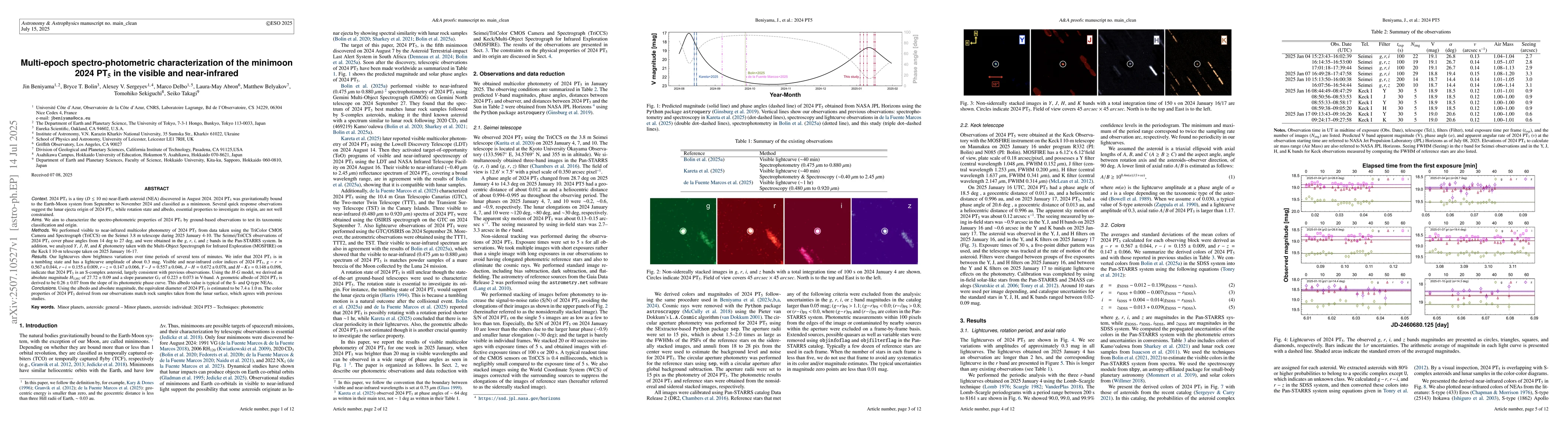 2024 PT$_5$ is a tiny ($D\leq10$ m) near-Earth asteroid (NEA) discovered in August 2024. 2024 PT$_5$ was gravitationally bound to the Earth-Moon system from September to November 2024 and classified as a minimoon. Several quick response observations suggest the lunar ejecta origin of 2024 PT$_5$, while rotation state and albedo, essential properties to investigate its origin, are not well constrained. We performed visible to near-infrared multicolor photometry of 2024 PT$_5$ from data taken using the TriColor CMOS Camera and Spectrograph (TriCCS) on the Seimei 3.8 m telescope during 2025 January 4-10. The Seimei/TriCCS observations of 2024 PT$_5$ cover phase angles from 14 deg to 27 deg, and were obtained in the $g$, $r$, $i$, and $z$ bands in the Pan-STARRS system. In addition, we analyzed $Y$, $J$, $H$, and $K$ photometry taken with the Multi-Object Spectrograph for Infrared Exploration (MOSFIRE) on the Keck I 10-m telescope taken on 2025 January 16-17. Our lightcurves show brightness variations over time periods of several tens of minutes. We infer that 2024 PT$_5$ is in a tumbling state and has a lightcurve amplitude of about 0.3 mag. Visible and near-infrared color indices of 2024 PT$_5$, $g-r=0.567\pm0.044$, $r-i=0.155\pm0.009$, $r-z=0.147\pm0.066$, $Y-J=0.557\pm0.046$, $J-H=0.672\pm0.078$, and $H-Ks=0.148\pm0.098$, indicate that 2024 PT$_5$ is an S-complex asteroid, largely consistent with previous observations. Using the $H$-$G$ model, we derived an absolute magnitude $H_{V,HG}$ of $27.72\pm0.09$ and a slope parameter $G_V$ of $0.223\pm0.073$ in V-band. A geometric albedo of 2024 PT$_5$ is derived to be $0.26\pm0.07$ from the slope of its photometric phase curve. This albedo value is typical of the S- and Q-type NEAs. The color properties of 2024 PT$_5$ derived from our observations match rock samples taken from the lunar surface, which agrees with previous studies.