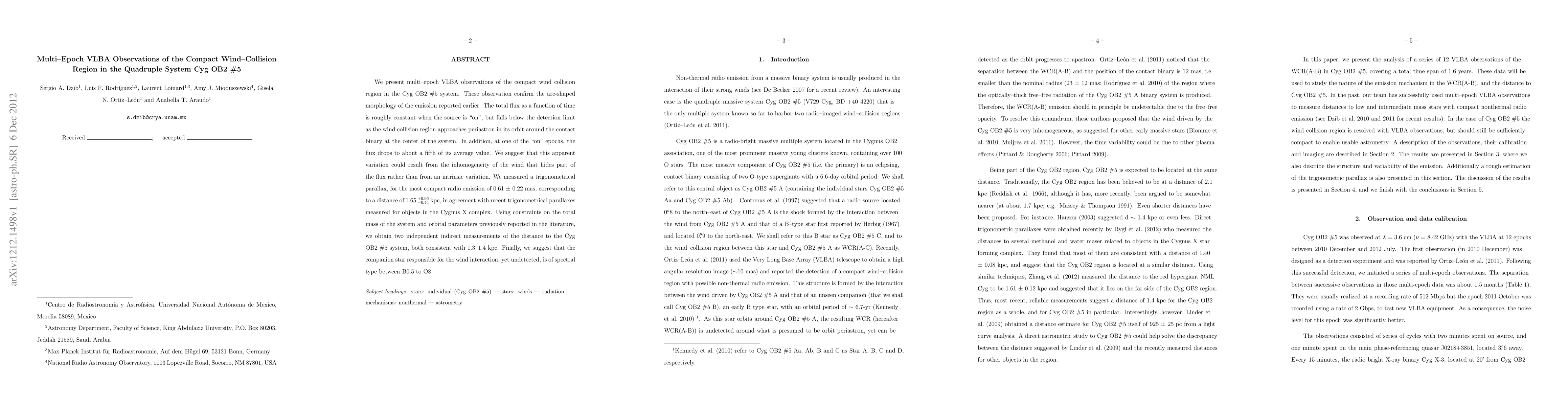 Astronomers observed a compact wind collision region in the Cyg OB2 #5 system using VLBA, confirming its arc-shaped morphology and estimating its distance to 1.3-1.4 kpc.
