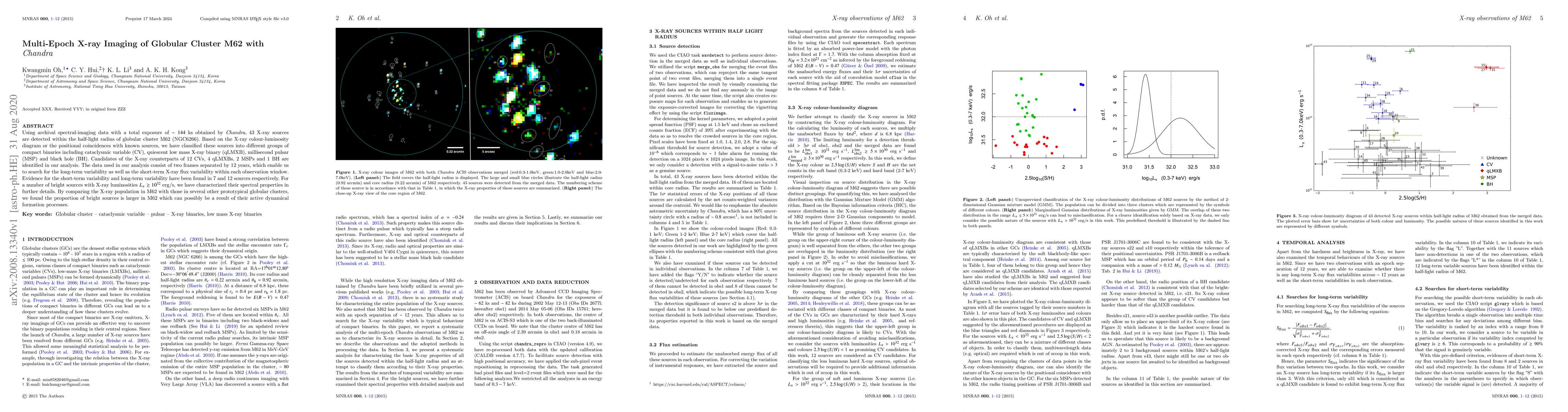 Using archival spectral-imaging data with a total exposure of $\sim144$ ks obtained by {\it Chandra}, 43 X-ray sources are detected within the half-light radius of globular cluster M62 (NGC6266). Based on the X-ray colour-luminosity diagram or the positional coincidences with known sources, we have classified these sources into different groups of compact binaries including cataclysmic variable (CV), quiescent low mass X-ray binary (qLMXB), millisecond pulsar (MSP) and black hole (BH). Candidates of the X-ray counterparts of 12 CVs, 4 qLMXBs, 2 MSPs and 1 BH are identified in our analysis. The data used in our analysis consist of two frames separated by 12 years, which enable us to search for the long-term variability as well as the short-term X-ray flux variability within each observation window. Evidence for the short-term variability and long-term variability have been found in 7 and 12 sources respectively. For a number of bright sources with X-ray luminosities $L_{x}\gtrsim 10^{32}$~erg/s, we have characterized their spectral properties in further details. By comparing the X-ray population in M62 with those in several other prototypical globular clusters, we found the proportion of bright sources is larger in M62 which can possibly be a result of their active dynamical formation processes.