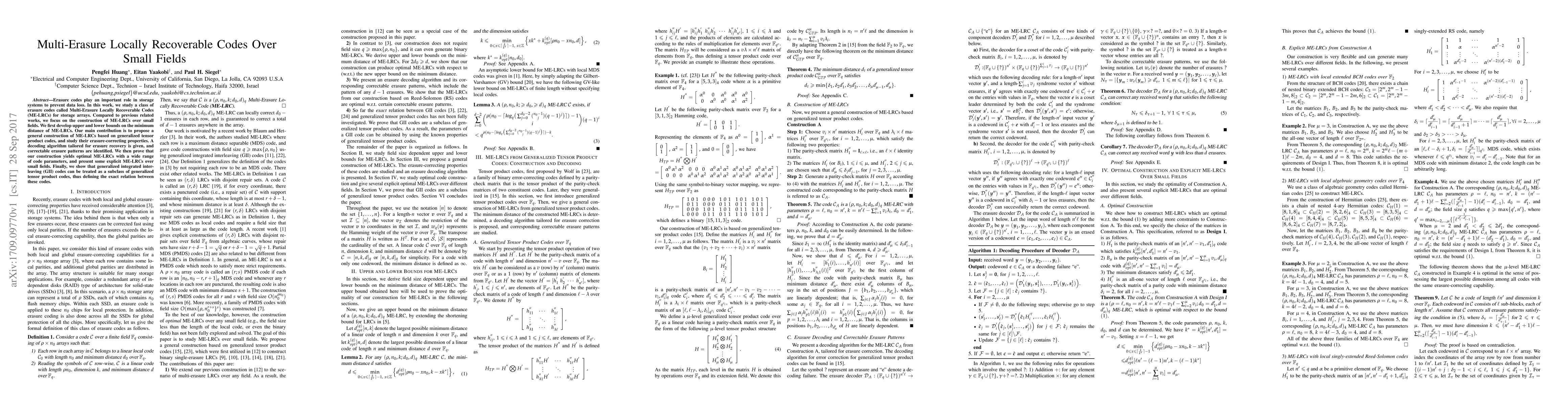 This paper proposes a construction for Multi-Erasure Locally Recoverable Codes (ME-LRCs) over small fields, developing upper and lower bounds on their minimum distance. The authors introduce a generalized tensor product code-based approach, provide a tailored decoding algorithm, and demonstrate optimal erasure-correcting properties.