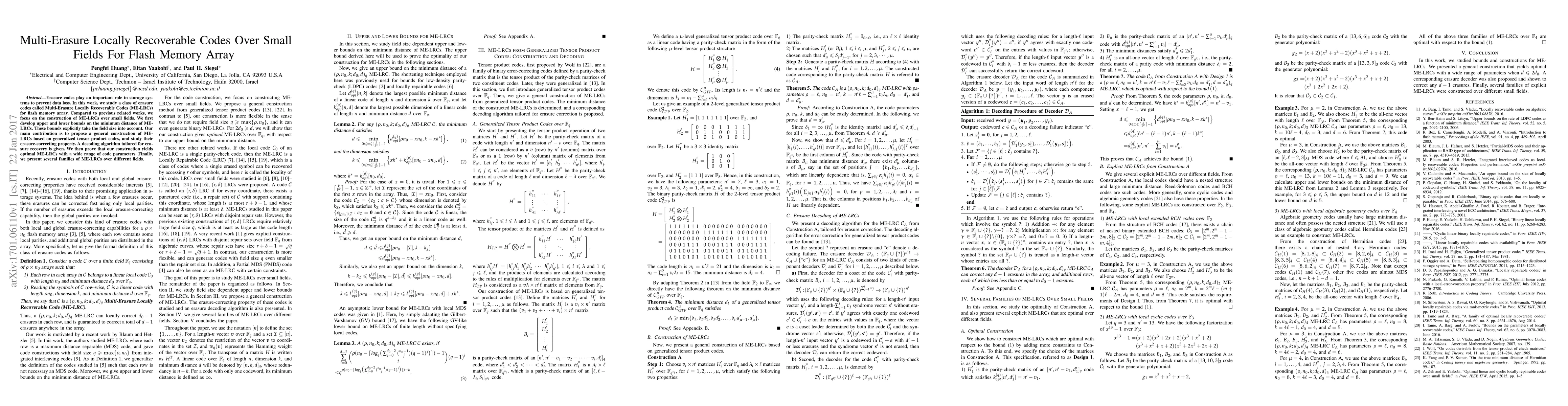 This paper proposes a new class of Multi-Erasure Locally Recoverable Codes (ME-LRCs) over small fields for flash memory arrays, developing upper and lower bounds on their minimum distance. The authors introduce a generalized tensor product construction and provide an optimal erasure-correcting decoding algorithm tailored for flash memory recovery.