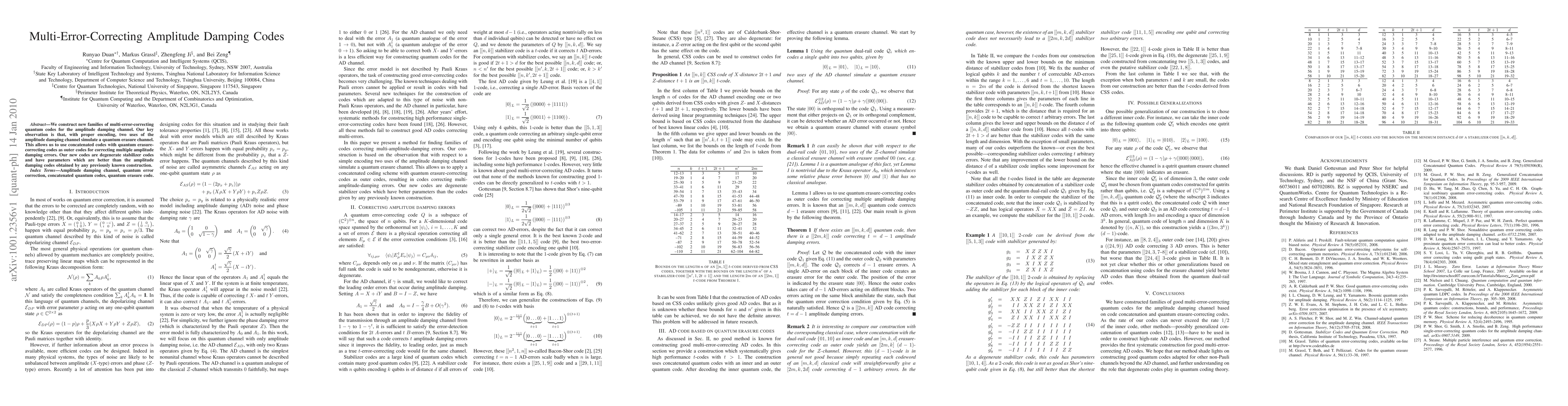 We construct new families of multi-error-correcting quantum codes for the amplitude damping channel. Our key observation is that, with proper encoding, two uses of the amplitude damping channel simulate a quantum erasure channel. This allows us to use concatenated codes with quantum erasure-correcting codes as outer codes for correcting multiple amplitude damping errors. Our new codes are degenerate stabilizer codes and have parameters which are better than the amplitude damping codes obtained by any previously known construction.