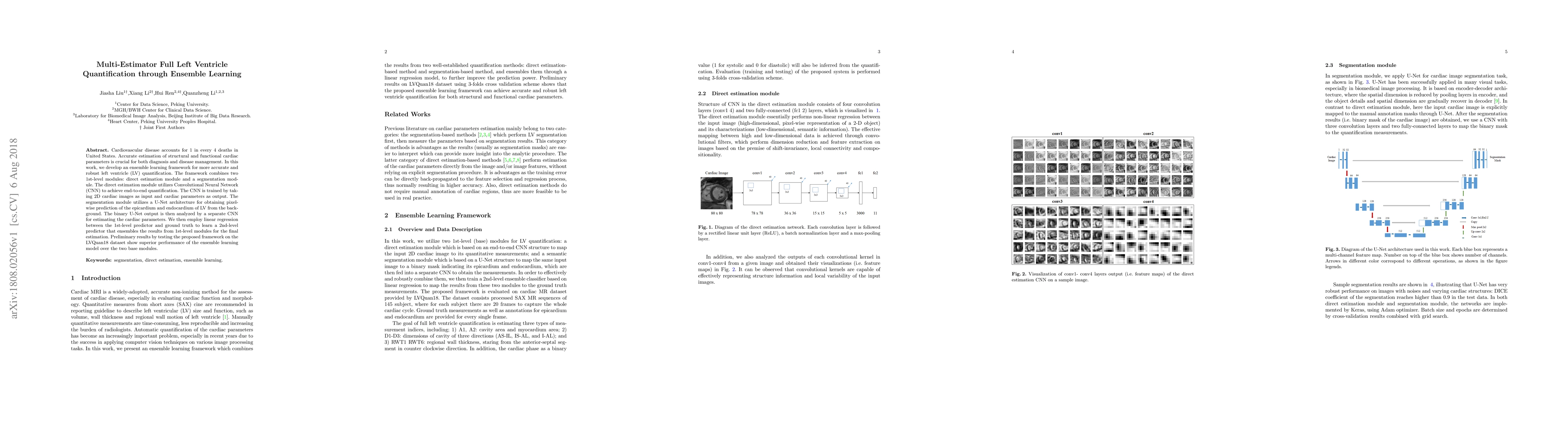 This paper proposes an ensemble learning framework for accurate left ventricle quantification using two modules: a direct estimation CNN and a segmentation U-Net. The framework combines their outputs via linear regression for improved accuracy, showing superior performance over individual modules on the LVQuan18 dataset.