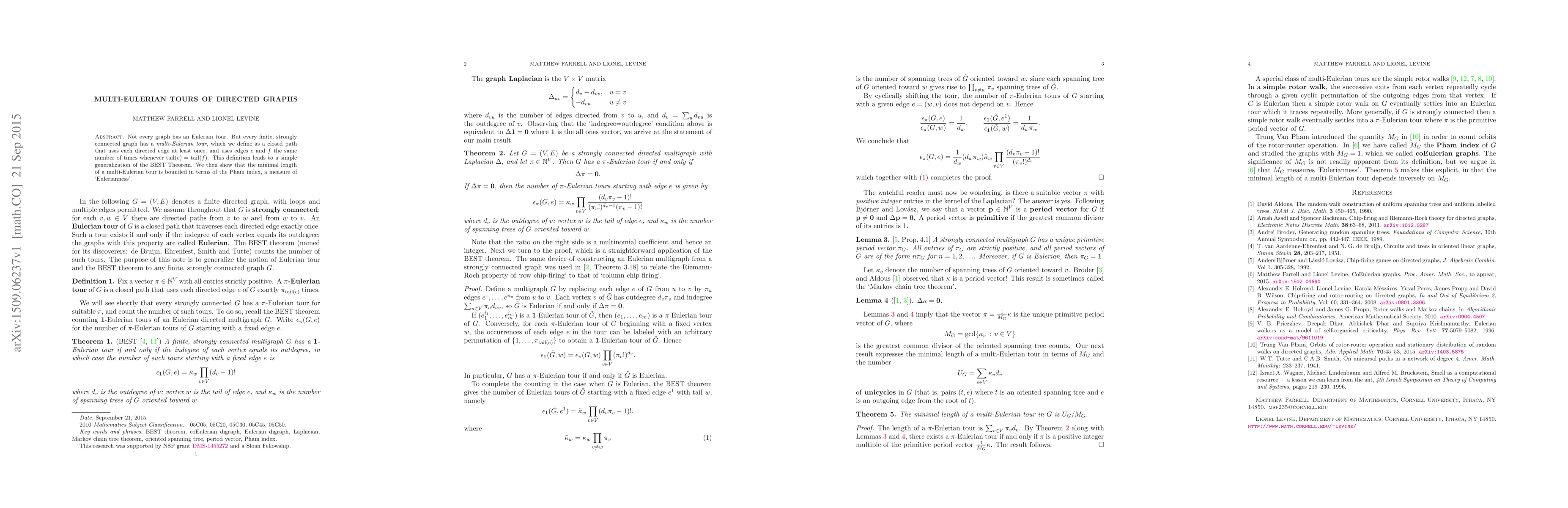 The paper introduces the concept of multi-Eulerian tours for directed graphs, generalizes the BEST theorem, and connects the existence and counting of these tours to the Laplacian matrix and the Pham index.