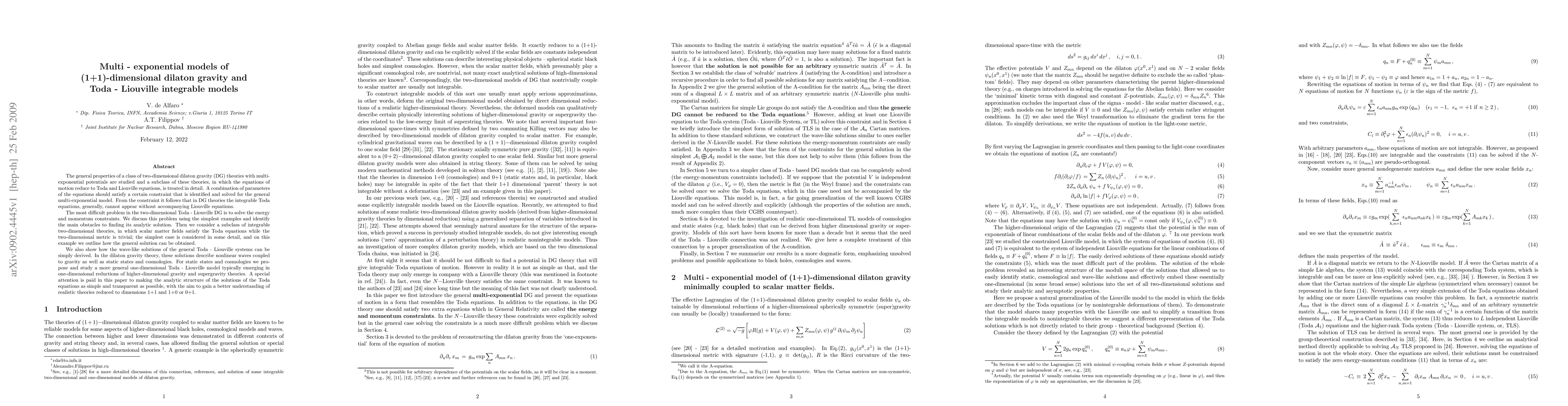 This paper explores multi-exponential potentials in two-dimensional dilaton gravity (DG) theories, identifying a subclass where equations of motion reduce to Toda and Liouville integrable models. It highlights the constraints necessary for these reductions and discusses the challenges in solving energy-momentum constraints, proposing simpler solutions for Toda-Liouville systems in DG.