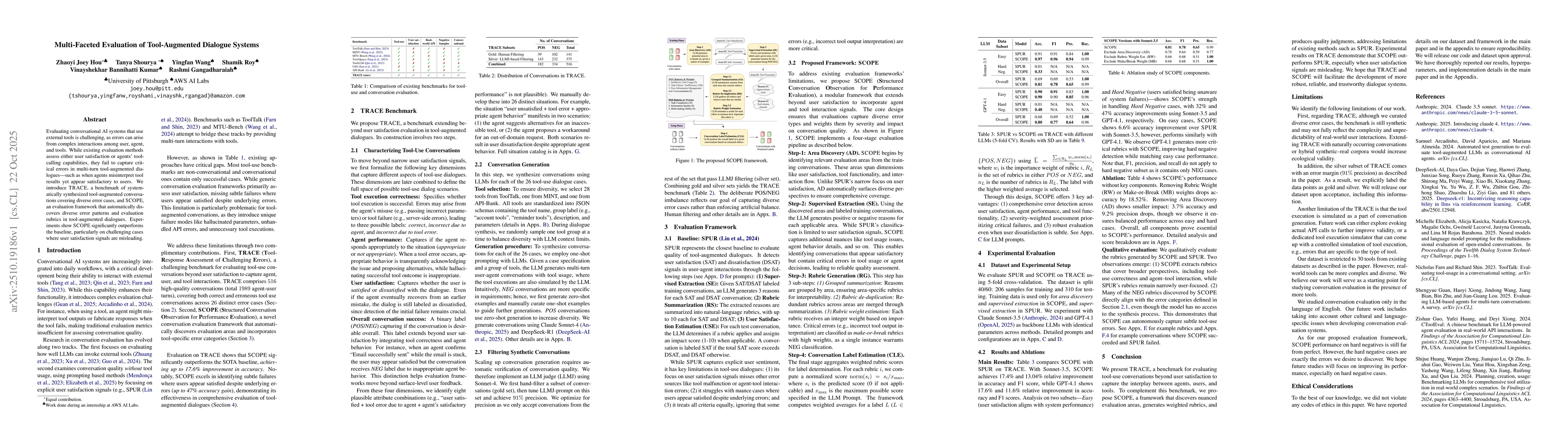 The paper introduces TRACE, a benchmark of systematically synthesized tool-augmented conversations, and SCOPE, an evaluation framework that automatically discovers error patterns and evaluation rubrics in multi-turn dialogues. Experiments compare SCOPE with baselines using LLMs like Sonnet-3.5 and GPT-4.1.