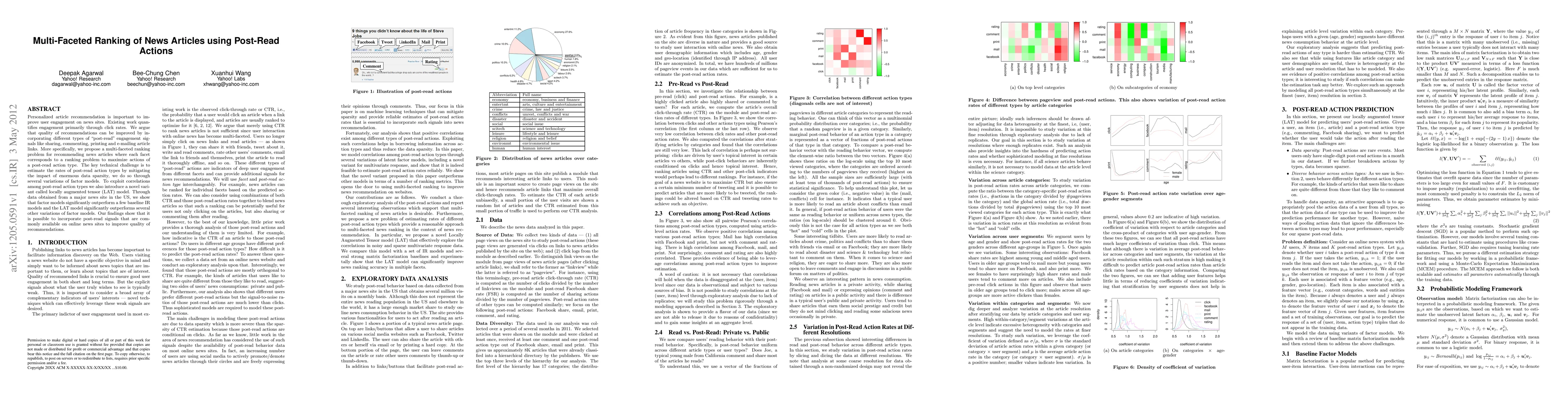 Personalized article recommendation is important to improve user engagement on news sites. Existing work quantifies engagement primarily through click rates. We argue that quality of recommendations can be improved by incorporating different types of "post-read" engagement signals like sharing, commenting, printing and e-mailing article links. More specifically, we propose a multi-faceted ranking problem for recommending news articles where each facet corresponds to a ranking problem to maximize actions of a post-read action type. The key technical challenge is to estimate the rates of post-read action types by mitigating the impact of enormous data sparsity, we do so through several variations of factor models. To exploit correlations among post-read action types we also introduce a novel variant called locally augmented tensor (LAT) model. Through data obtained from a major news site in the US, we show that factor models significantly outperform a few baseline IR models and the LAT model significantly outperforms several other variations of factor models. Our findings show that it is possible to incorporate post-read signals that are commonly available on online news sites to improve quality of recommendations.