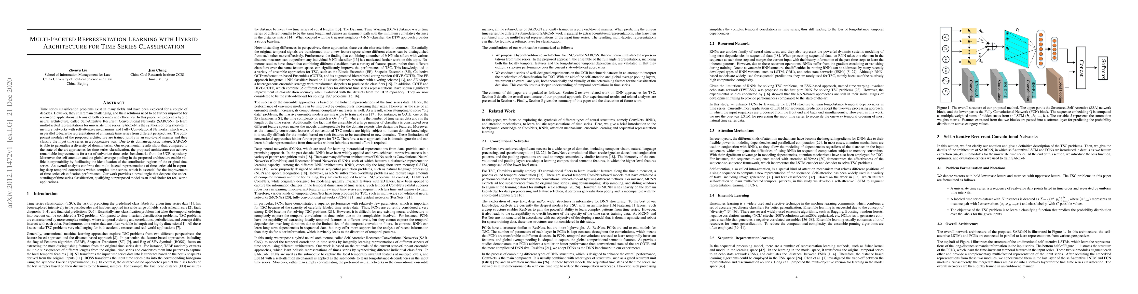 Time series classification problems exist in many fields and have been explored for a couple of decades. However, they still remain challenging, and their solutions need to be further improved for real-world applications in terms of both accuracy and efficiency. In this paper, we propose a hybrid neural architecture, called Self-Attentive Recurrent Convolutional Networks (SARCoN), to learn multi-faceted representations for univariate time series. SARCoN is the synthesis of long short-term memory networks with self-attentive mechanisms and Fully Convolutional Networks, which work in parallel to learn the representations of univariate time series from different perspectives. The component modules of the proposed architecture are trained jointly in an end-to-end manner and they classify the input time series in a cooperative way. Due to its domain-agnostic nature, SARCoN is able to generalize a diversity of domain tasks. Our experimental results show that, compared to the state-of-the-art approaches for time series classification, the proposed architecture can achieve remarkable improvements for a set of univariate time series benchmarks from the UCR repository. Moreover, the self-attention and the global average pooling in the proposed architecture enable visible interpretability by facilitating the identification of the contribution regions of the original time series. An overall analysis confirms that multi-faceted representations of time series aid in capturing deep temporal corrections within complex time series, which is essential for the improvement of time series classification performance. Our work provides a novel angle that deepens the understanding of time series classification, qualifying our proposed model as an ideal choice for real-world applications.