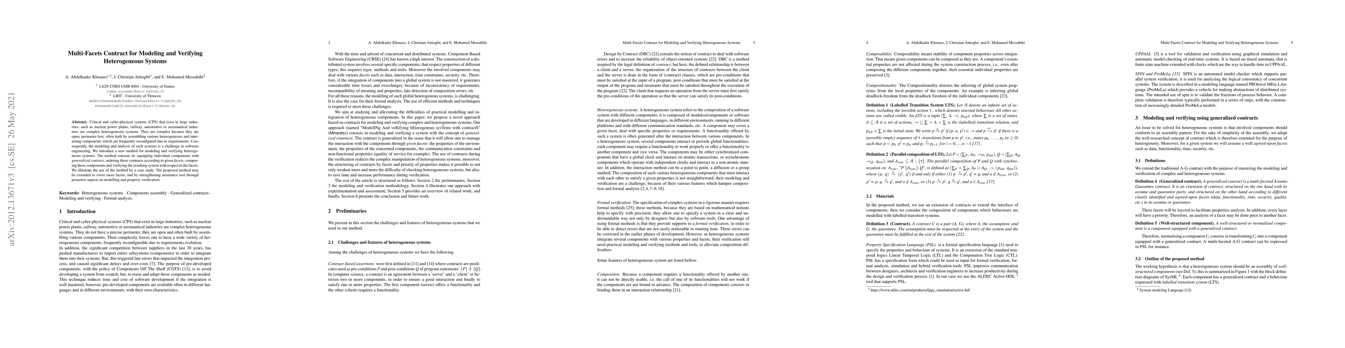 Critical and cyber-physical systems (CPS) that exist in large industries, such as nuclear power plants, railway, automotive or aeronautical industries are complex heterogeneous systems. They are complex because they are open, perimeter-less, often built by assembling various heterogeneous and interacting components which are frequently reconfigured due to requirements. Consequently, the modeling and analysis of such systems is a challenge in software engineering. We introduce a new method for modeling and verifying heterogeneous systems. The method consists in: equipping individual components with generalized contract, ordering these contracts according to given facets, composing these components and verifying the resulting system with respect to the facets. We illustrate the use of the method by a case study. The proposed method may be extended to cover more facets, and by strengthening assistance tool through proactive aspects in modelling and property verification.