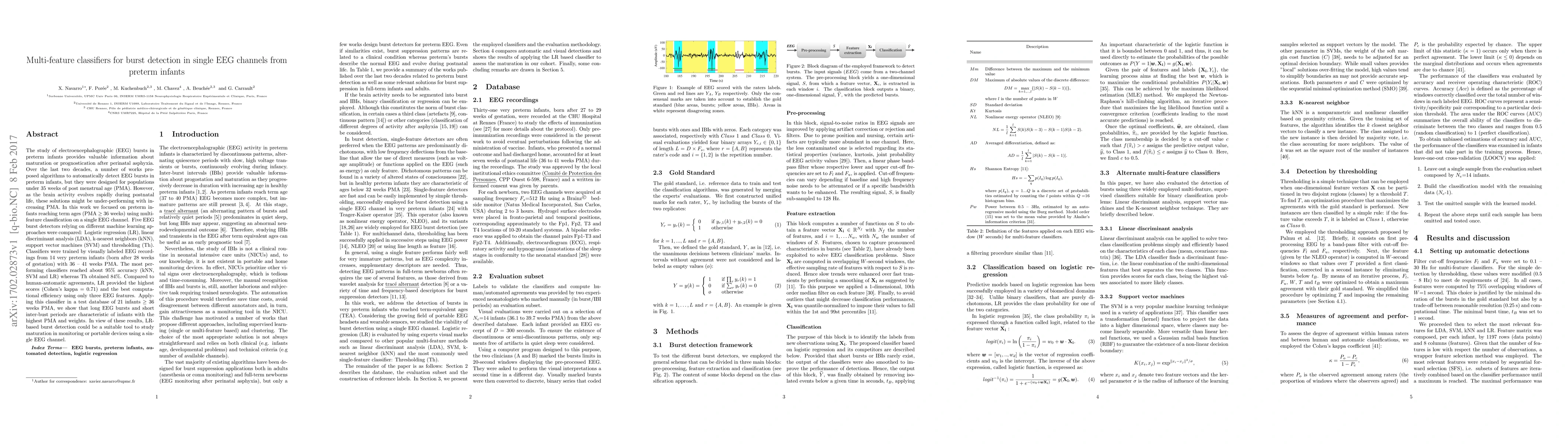 This study develops multi-feature classifiers for detecting EEG bursts in preterm infants reaching term ages, employing logistic regression, linear discriminant analysis, k-nearest neighbors, support vector machines, and thresholding. Logistic regression showed the best performance and efficiency, making it a promising tool for monitoring maturation in portable devices.