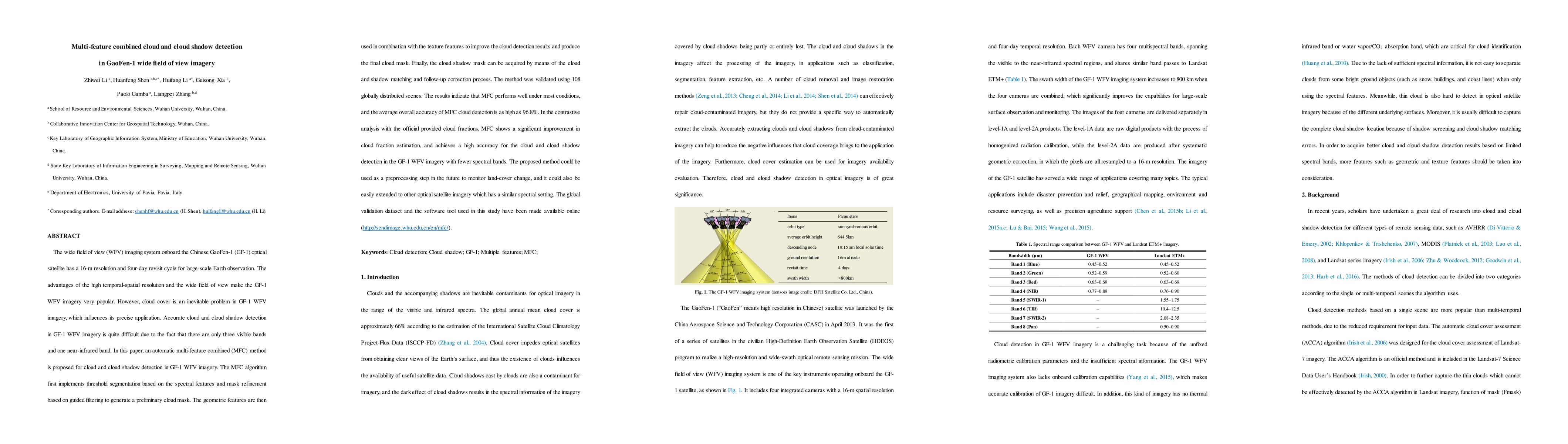 The wide field of view (WFV) imaging system onboard the Chinese GaoFen-1 (GF-1) optical satellite has a 16-m resolution and four-day revisit cycle for large-scale Earth observation. The advantages of the high temporal-spatial resolution and the wide field of view make the GF-1 WFV imagery very popular. However, cloud cover is an inevitable problem in GF-1 WFV imagery, which influences its precise application. Accurate cloud and cloud shadow detection in GF-1 WFV imagery is quite difficult due to the fact that there are only three visible bands and one near-infrared band. In this paper, an automatic multi-feature combined (MFC) method is proposed for cloud and cloud shadow detection in GF-1 WFV imagery. The MFC algorithm first implements threshold segmentation based on the spectral features and mask refinement based on guided filtering to generate a preliminary cloud mask. The geometric features are then used in combination with the texture features to improve the cloud detection results and produce the final cloud mask. Finally, the cloud shadow mask can be acquired by means of the cloud and shadow matching and follow-up correction process. The method was validated using 108 globally distributed scenes. The results indicate that MFC performs well under most conditions, and the average overall accuracy of MFC cloud detection is as high as 96.8%. In the contrastive analysis with the official provided cloud fractions, MFC shows a significant improvement in cloud fraction estimation, and achieves a high accuracy for the cloud and cloud shadow detection in the GF-1 WFV imagery with fewer spectral bands. The proposed method could be used as a preprocessing step in the future to monitor land-cover change, and it could also be easily extended to other optical satellite imagery which has a similar spectral setting.