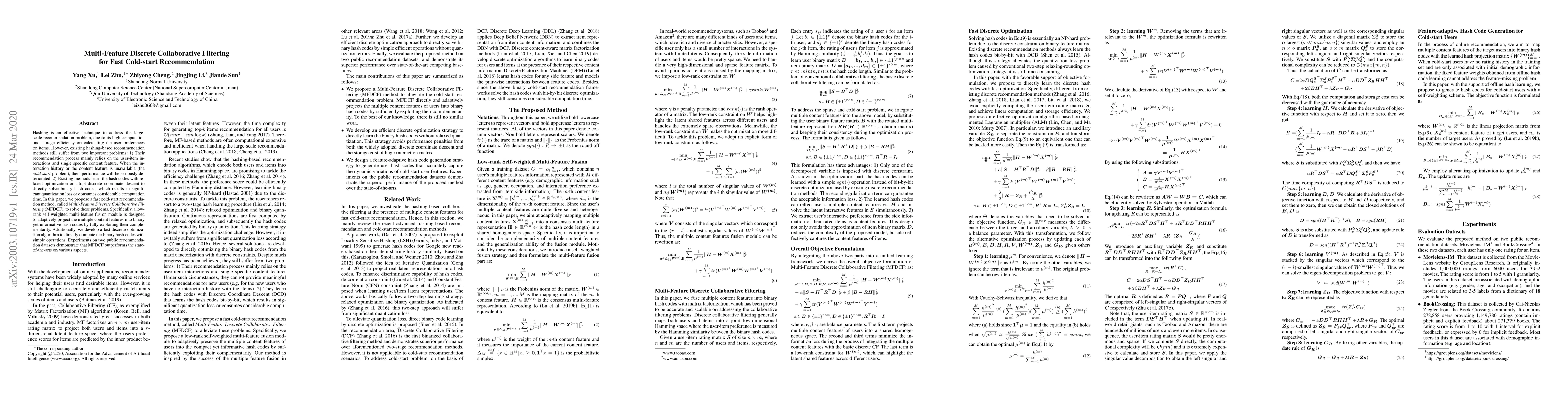 The paper proposes Multi-Feature Discrete Collaborative Filtering (MFDCF) to enhance large-scale recommendation systems, addressing cold-start issues by leveraging multiple content features and fast discrete optimization to generate informative hash codes, outperforming existing methods on public datasets.