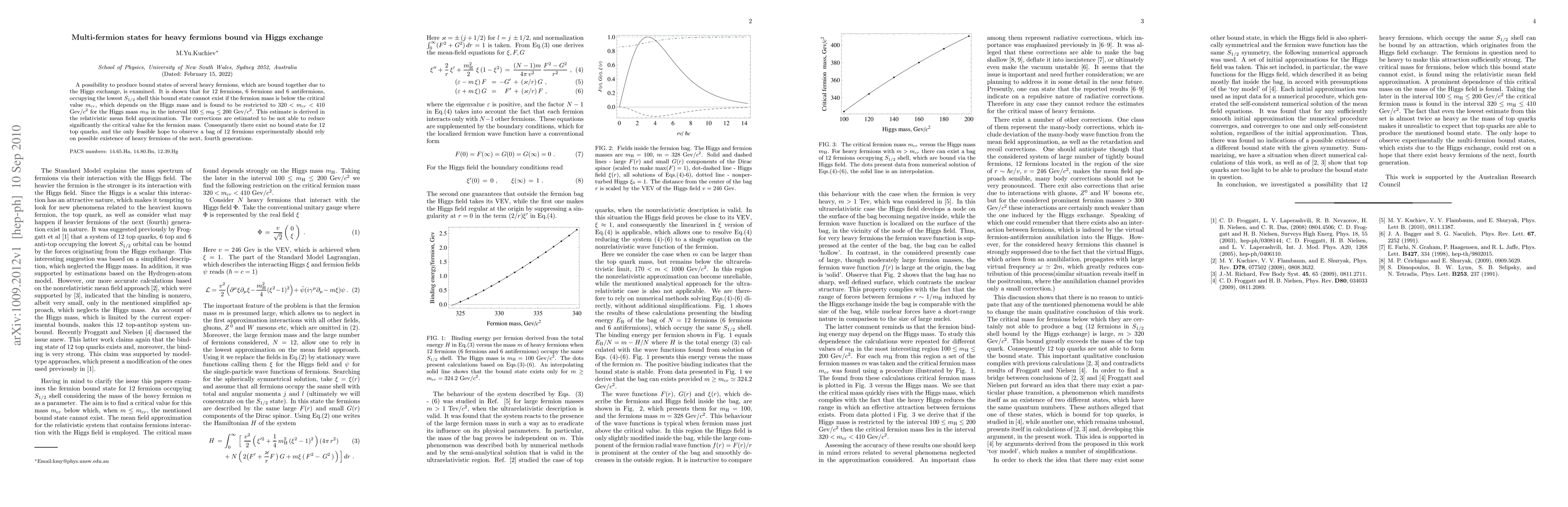 Researchers found that bound states of 12 heavy fermions cannot exist if their mass is below a critical value, which depends on the Higgs mass and ranges from 320 to 410 GeV/c^2 for a specific Higgs mass range.