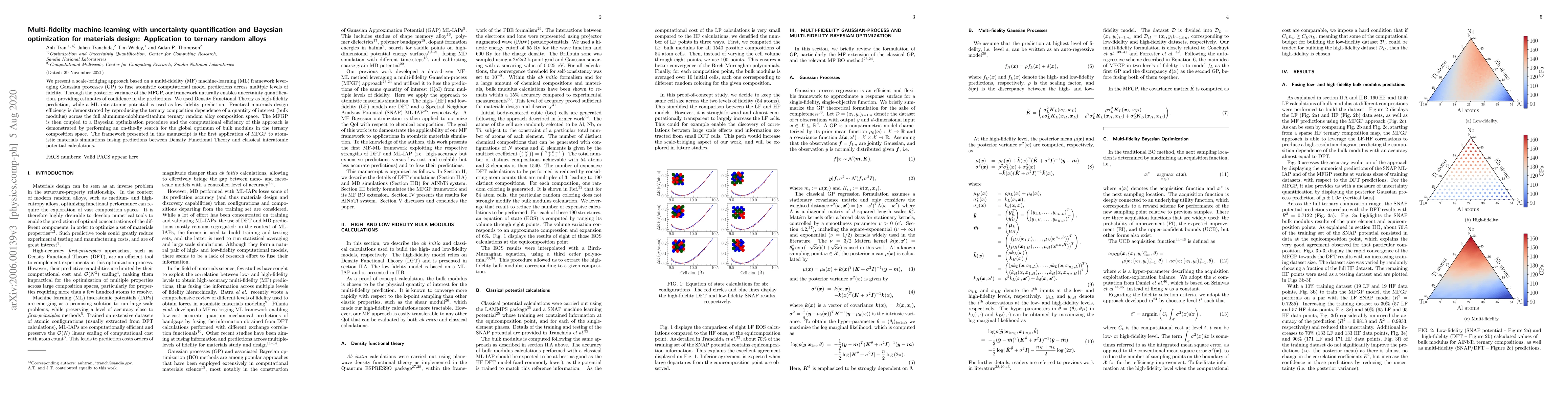 This paper introduces a multi-fidelity machine-learning framework using Gaussian processes to integrate high-fidelity Density Functional Theory and low-fidelity ML interatomic potentials for efficient materials design. The approach demonstrates computational efficiency in optimizing the bulk modulus of ternary aluminum-niobium-titanium alloys.