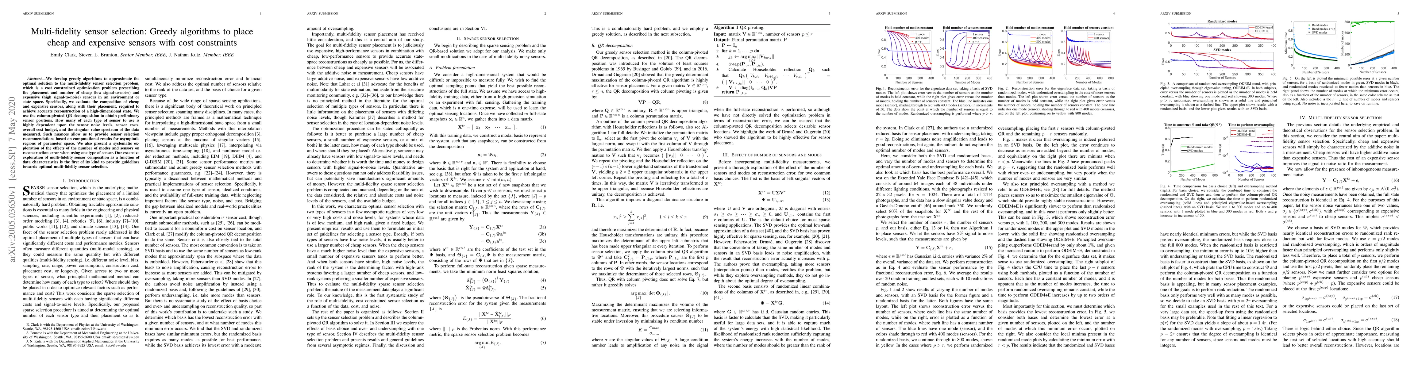 This paper develops greedy algorithms to optimize the placement and number of cheap and expensive sensors under cost constraints, aiming to accurately reconstruct high-dimensional state spaces. It uses column-pivoted QR decomposition for initial sensor positioning and provides guidelines for optimal multi-fidelity sensor selection based on computational results and data characteristics.