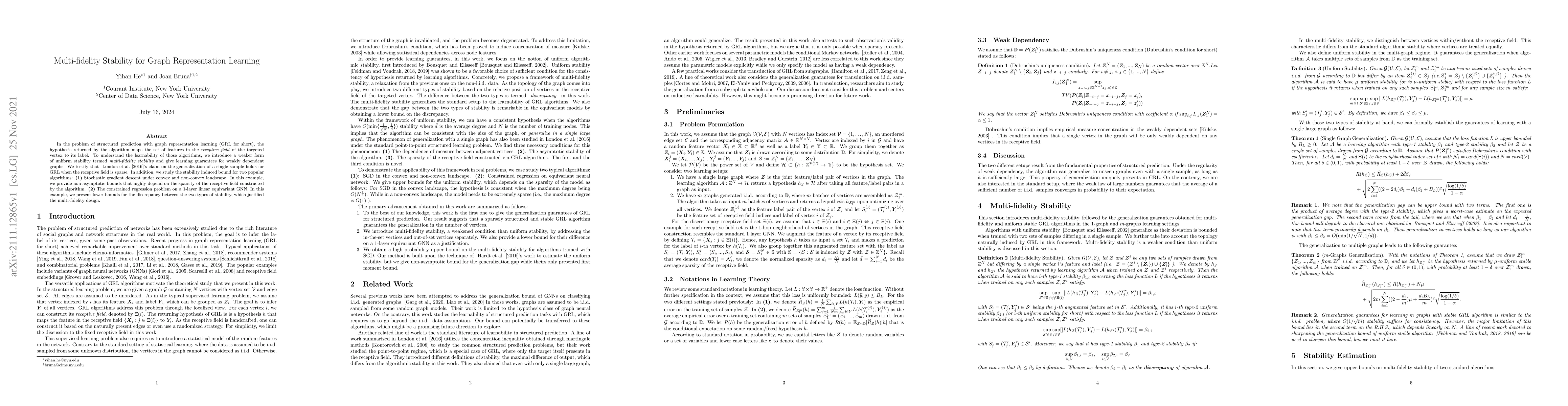 In the problem of structured prediction with graph representation learning (GRL for short), the hypothesis returned by the algorithm maps the set of features in the \emph{receptive field} of the targeted vertex to its label. To understand the learnability of those algorithms, we introduce a weaker form of uniform stability termed \emph{multi-fidelity stability} and give learning guarantees for weakly dependent graphs. We testify that ~\citet{london2016stability}'s claim on the generalization of a single sample holds for GRL when the receptive field is sparse. In addition, we study the stability induced bound for two popular algorithms: \textbf{(1)} Stochastic gradient descent under convex and non-convex landscape. In this example, we provide non-asymptotic bounds that highly depend on the sparsity of the receptive field constructed by the algorithm. \textbf{(2)} The constrained regression problem on a 1-layer linear equivariant GNN. In this example, we present lower bounds for the discrepancy between the two types of stability, which justified the multi-fidelity design.