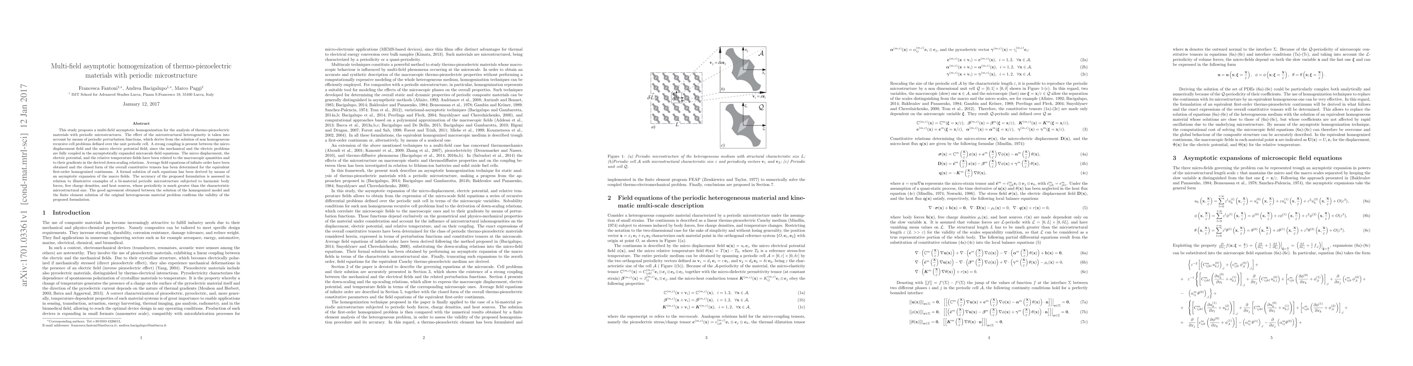 This study develops a multi-field asymptotic homogenization method for thermo-piezoelectric materials with periodic microstructures, deriving constitutive tensors for a homogenized continuum and validating the approach through examples showing good agreement with finite element solutions.