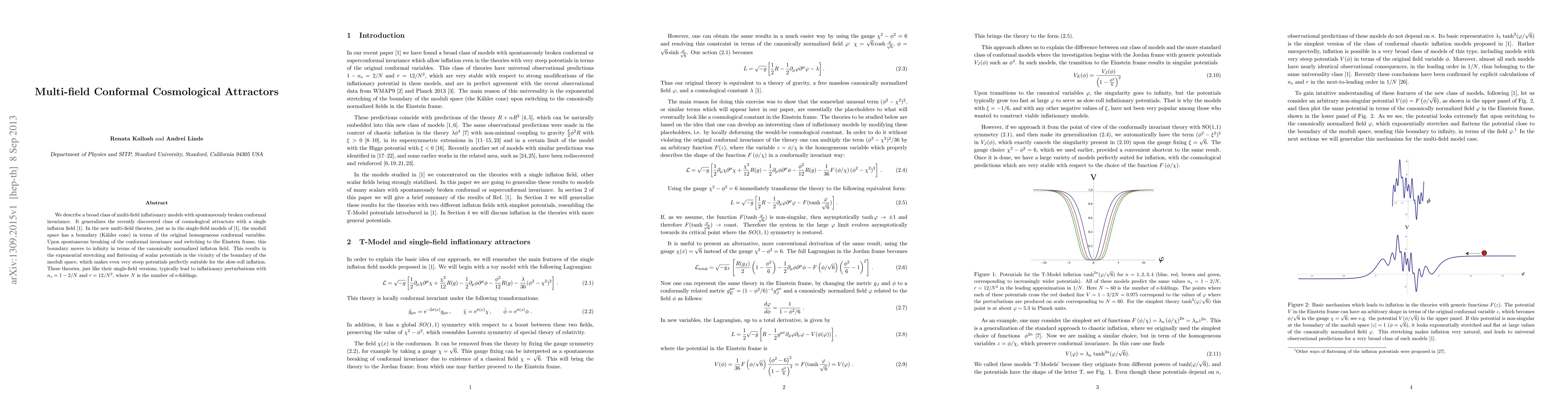 We describe a broad class of multi-field inflationary models with spontaneously broken conformal invariance. It generalizes the recently discovered class of cosmological attractors with a single inflaton field. In the new multi-field theories, just as in the previously studied single-field models, the moduli space has a boundary (Kahler cone) in terms of the original homogeneous conformal variables. Upon spontaneous breaking of the conformal invariance and switching to the Einstein frame, this boundary moves to infinity in terms of the canonically normalized inflaton field. This results in the exponential stretching and flattening of scalar potentials in the vicinity of the boundary of the moduli space, which makes even very steep potentials perfectly suitable for the slow-roll inflation. These theories, just like their single-field versions, typically lead to inflationary perturbations with n_s =1-2/N and r = 12/N^2, where N is the number of e-foldings.