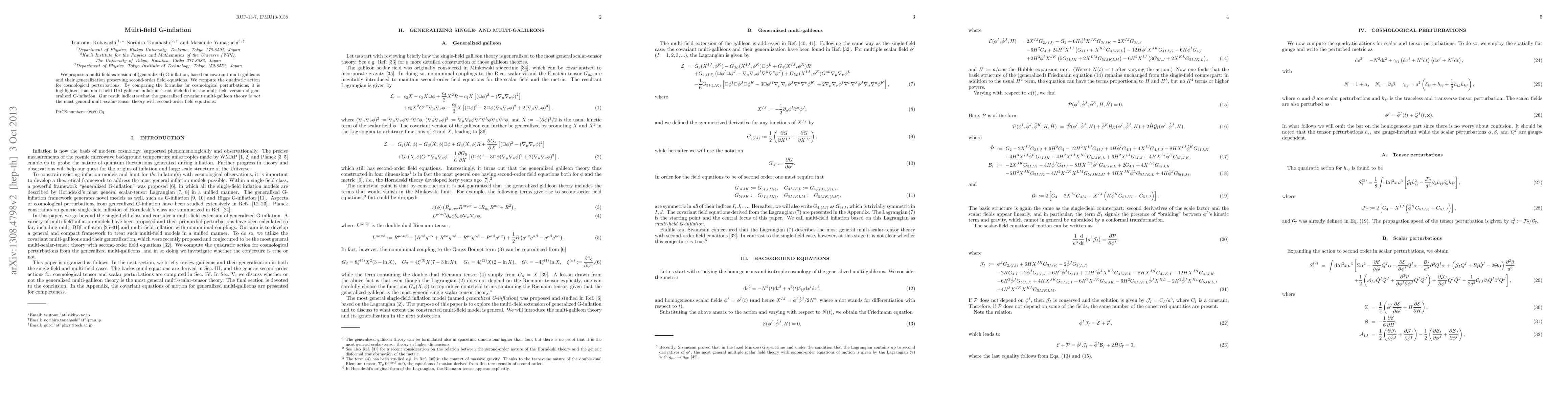 The research proposes a multi-field extension of G-inflation based on covariant multi-galileons, preserving second-order field equations. It computes the quadratic action for cosmological perturbations.