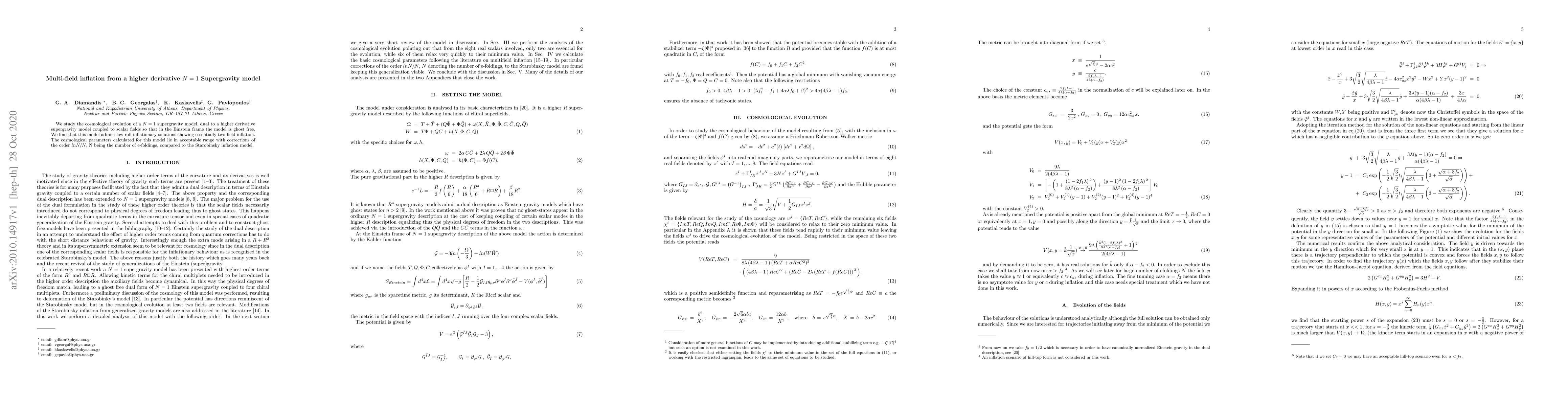 We study the cosmological evolution of a N = 1 supergravity model, dual to a higher derivative supergravity model coupled to scalar fields so that in the Einstein frame the model is ghost free. We find that this model admit slow roll inflationary solutions showing essentially two-field inflation. The cosmological parameters calculated for this model lie in acceptable range with corrections of the order lnN/N, N being the number of e-foldings, compared to the Starobinsky inflation model.