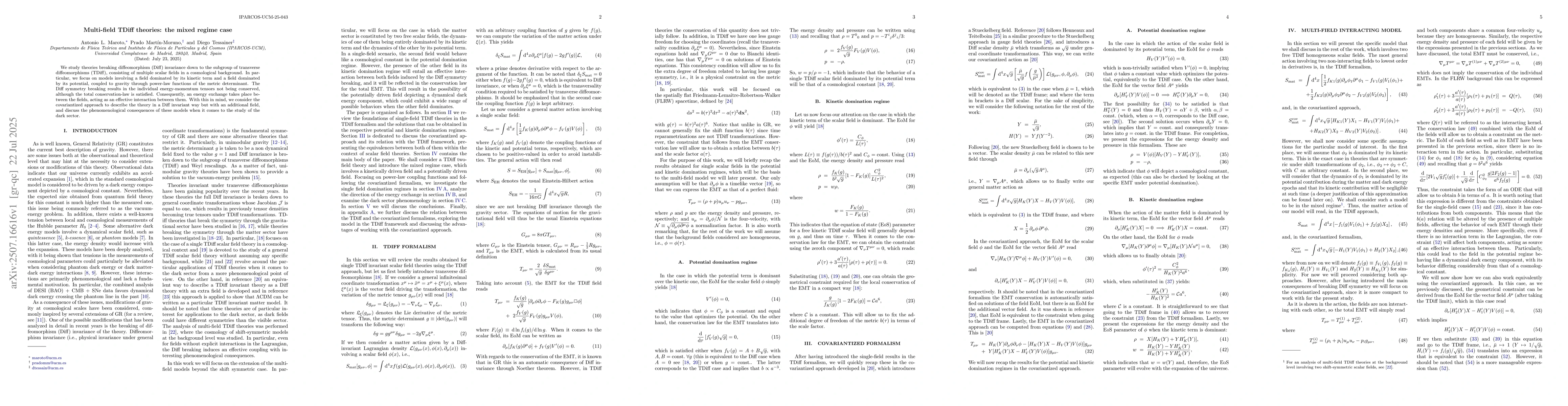 This work provides deeper insight into multi-field TDiff models and their cosmological implications, particularly relevant for describing a dynamical dark sector, and lays groundwork for future projects including perturbation theory and observational comparisons.