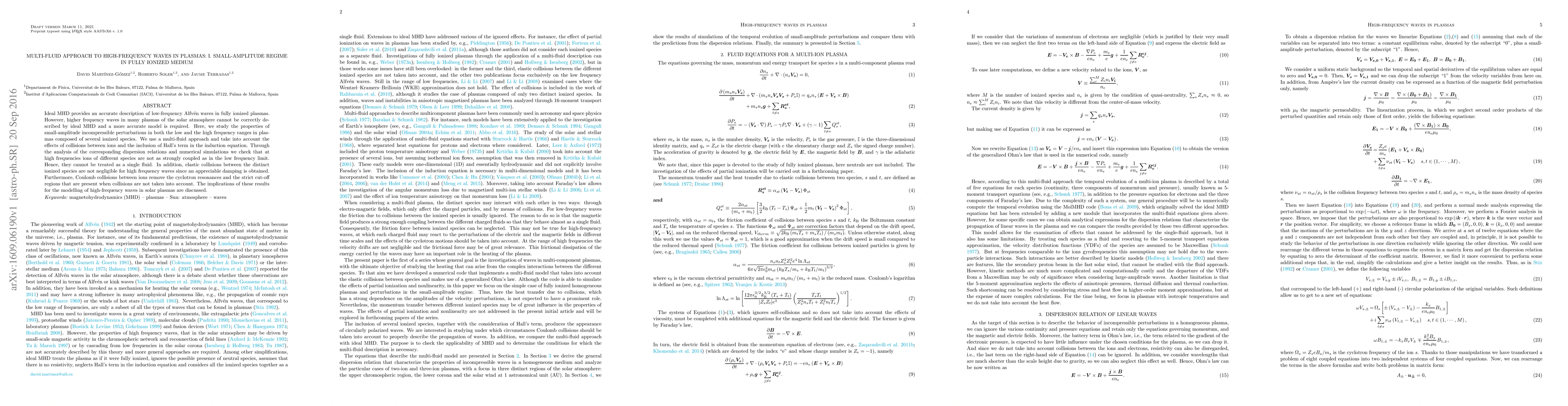 This paper employs a multi-fluid approach to study small-amplitude waves in fully ionized plasmas, revealing that high-frequency waves require a more detailed model than ideal MHD. The analysis shows that ions of different species are less coupled at high frequencies and collisions significantly affect wave damping, impacting the modelling of solar plasma waves.