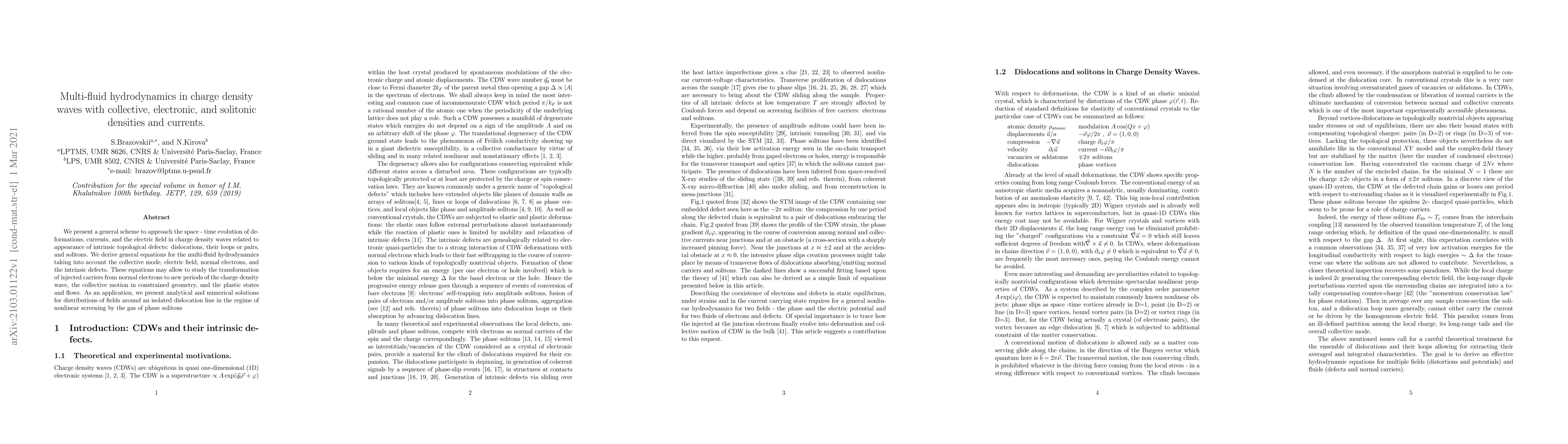 We present a general scheme to approach the space - time evolution of deformations, currents, and the electric field in charge density waves related to appearance of intrinsic topological defects: dislocations, their loops or pairs, and solitons. We derive general equations for the multi-fluid hydrodynamics taking into account the collective mode, electric field, normal electrons, and the intrinsic defects. These equations may allow to study the transformation of injected carriers from normal electrons to new periods of the charge density wave, the collective motion in constrained geometry, and the plastic states and flows. As an application, we present analytical and numerical solutions for distributions of fields around an isolated dislocation line in the regime of nonlinear screening by the gas of phase solitons.