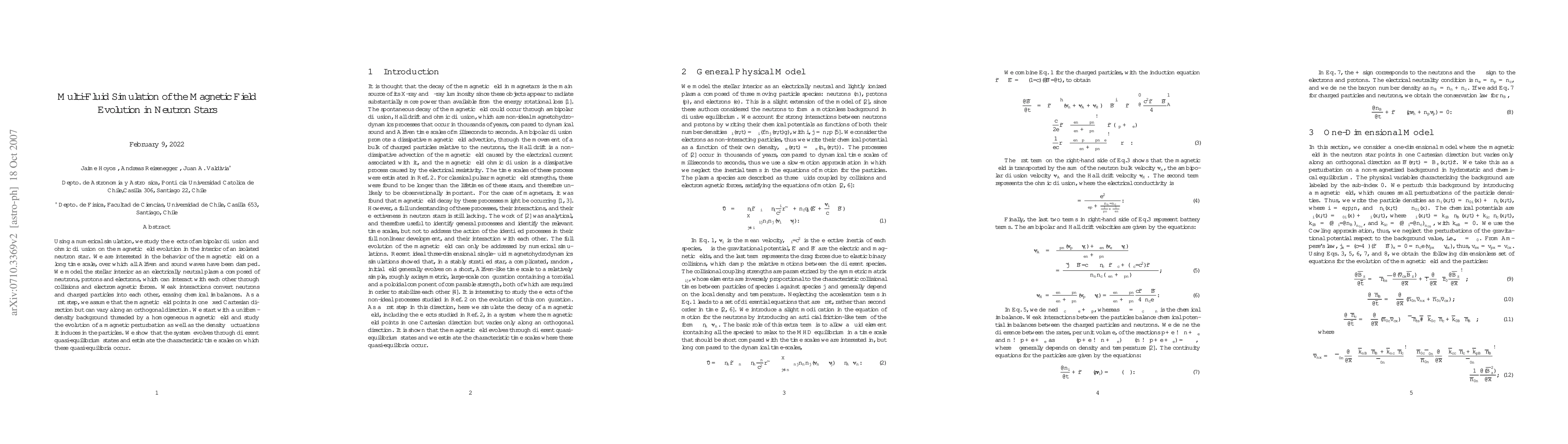 Using a numerical simulation, we study the effects of ambipolar diffusion and ohmic diffusion on the magnetic field evolution in the interior of an isolated neutron star. We are interested in the behavior of the magnetic field on a long time scale, over which all Alfven and sound waves have been damped. We model the stellar interior as an electrically neutral plasma composed of neutrons, protons and electrons, which can interact with each other through collisions and electromagnetic forces. Weak interactions convert neutrons and charged particles into each other, erasing chemical imbalances. As a first step, we assume that the magnetic field points in one fixed Cartesian direction but can vary along an orthogonal direction. We start with a uniform-density background threaded by a homogeneous magnetic field and study the evolution of a magnetic perturbation as well as the density fluctuations it induces in the particles. We show that the system evolves through different quasi-equilibrium states and estimate the characteristic time scales on which these quasi-equilibria occur.