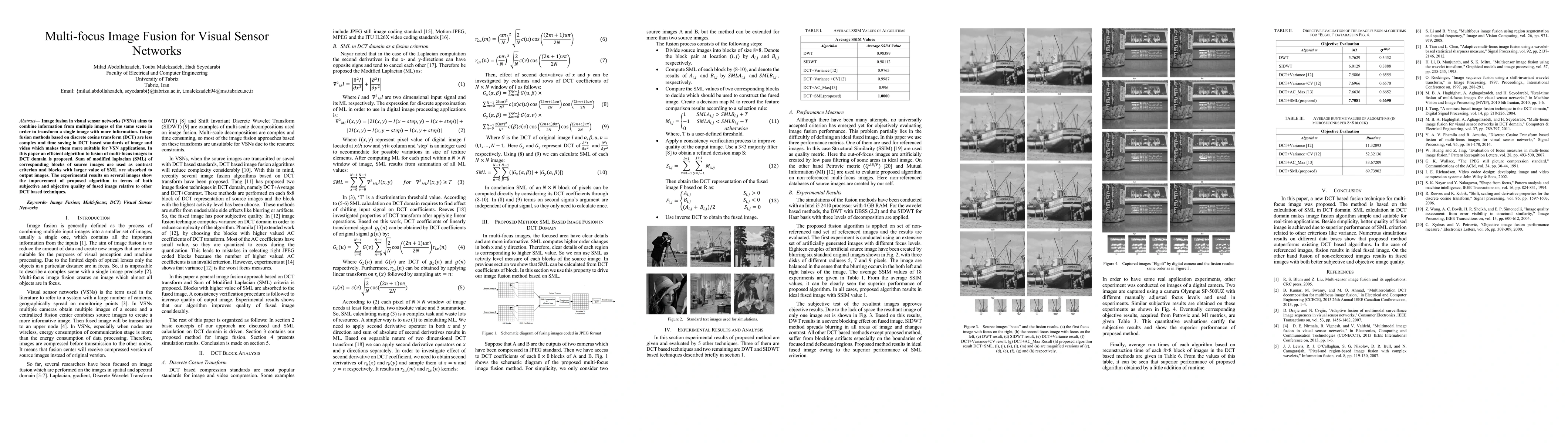 This paper proposes an efficient algorithm for fusing multi-focus images in visual sensor networks using discrete cosine transform (DCT). The method employs the Sum of modified laplacian (SML) as a contrast criterion to select blocks from source images, resulting in better fused image quality compared to other DCT-based techniques.