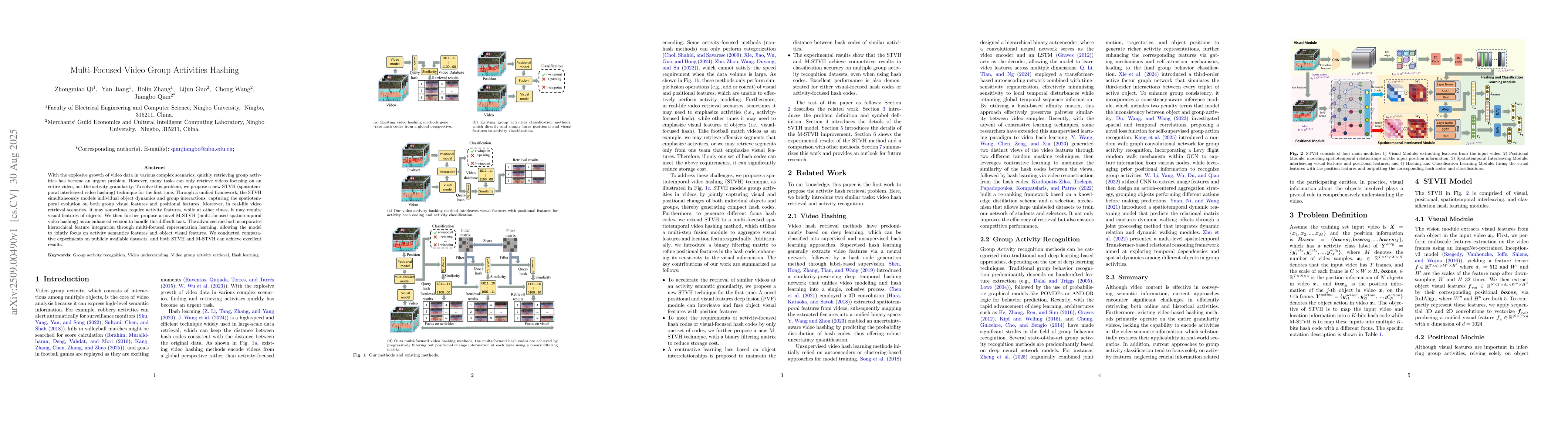 With the explosive growth of video data in various complex scenarios, quickly retrieving group activities has become an urgent problem. However, many tasks can only retrieve videos focusing on an entire video, not the activity granularity. To solve this problem, we propose a new STVH (spatiotemporal interleaved video hashing) technique for the first time. Through a unified framework, the STVH simultaneously models individual object dynamics and group interactions, capturing the spatiotemporal evolution on both group visual features and positional features. Moreover, in real-life video retrieval scenarios, it may sometimes require activity features, while at other times, it may require visual features of objects. We then further propose a novel M-STVH (multi-focused spatiotemporal video hashing) as an enhanced version to handle this difficult task. The advanced method incorporates hierarchical feature integration through multi-focused representation learning, allowing the model to jointly focus on activity semantics features and object visual features. We conducted comparative experiments on publicly available datasets, and both STVH and M-STVH can achieve excellent results.