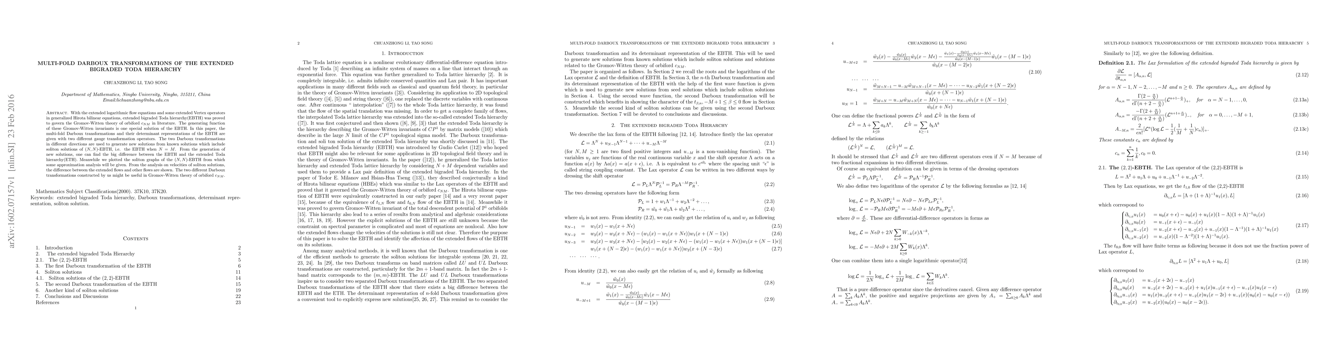 With the extended logarithmic flow equations and some extended Vertex operators in generalized Hirota bilinear equations, extended bigraded Toda hierarchy(EBTH) was proved to govern the Gromov-Witten theory of orbiford $c_{NM}$ in literature. The generating function of these Gromov-Witten invariants is one special solution of the EBTH. In this paper, the multi-fold Darboux transformations and their determinant representations of the EBTH are given with two different gauge transformation operators. The two Darboux transformations in different directions are used to generate new solutions from known solutions which include soliton solutions of $(N,N)$-EBTH, i.e. the EBTH when $N=M$. From the generation of new solutions, one can find the big difference between the EBTH and the extended Toda hierarchy(ETH). Meanwhile we plotted the soliton graphs of the $(N,N)$-EBTH from which some approximation analysis will be given. From the analysis on velocities of soliton solutions, the difference between the extended flows and other flows are shown. The two different Darboux transformations constructed by us might be useful in Gromov-Witten theory of orbiford $c_{NM}$.