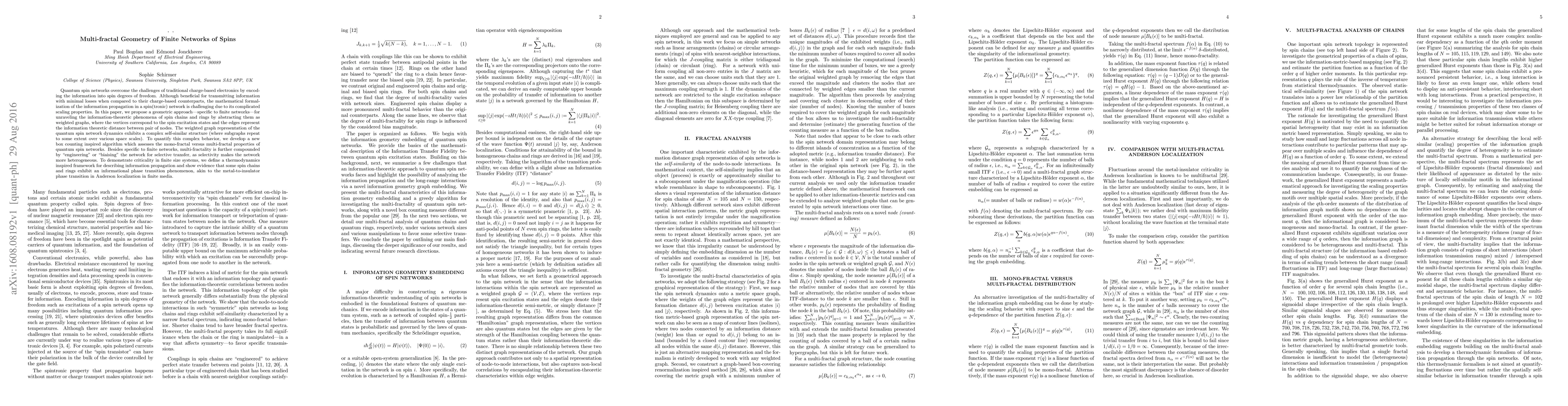 Quantum spin networks overcome the challenges of traditional charge-based electronics by encoding the information into spin degrees of freedom. Although beneficial for transmitting information with minimal losses when compared to their charge-based counterparts, the mathematical formalization of the information propagation in a spin(tronic) network is challenging due to its complicated scaling properties. In this paper, we propose a geometric approach---specific to finite networks---for unraveling the information-theoretic phenomena of spin chains and rings by abstracting them as weighted graphs, where the vertices correspond to the spin excitation states and the edges represent the information theoretic distance between pair of nodes. The weighted graph representation of the quantum spin network dynamics exhibits a complex self-similar structure (where subgraphs repeat to some extent over various space scales). To quantify this complex behavior, we develop a new box counting inspired algorithm which assesses the mono-fractal versus multi-fractal properties of quantum spin networks. Besides specific to finite networks, multi-fractality is further compounded by "engineering" or "biasing" the network for selective transfer, as selectivity makes the network more heterogeneous. To demonstrate criticality in finite size systems, we define a thermodynamics inspired framework for describing information propagation and show evidence that some spin chains and rings exhibit an informational phase transition phenomenon, akin to the metal-to-insulator phase transition in Anderson localization in finite media.}