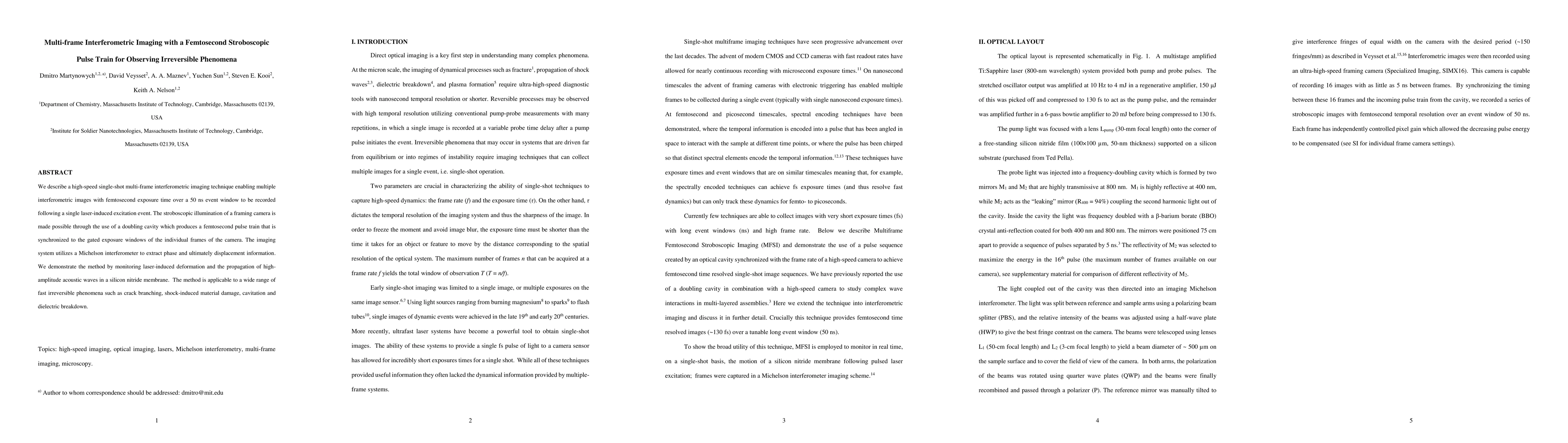 This paper presents a high-speed interferometric imaging technique using femtosecond pulse trains to capture multiple images within a 50 ns event window, enabling observation of fast irreversible phenomena like crack branching and shock damage. The method employs a synchronized framing camera and a Michelson interferometer to record phase and displacement data.