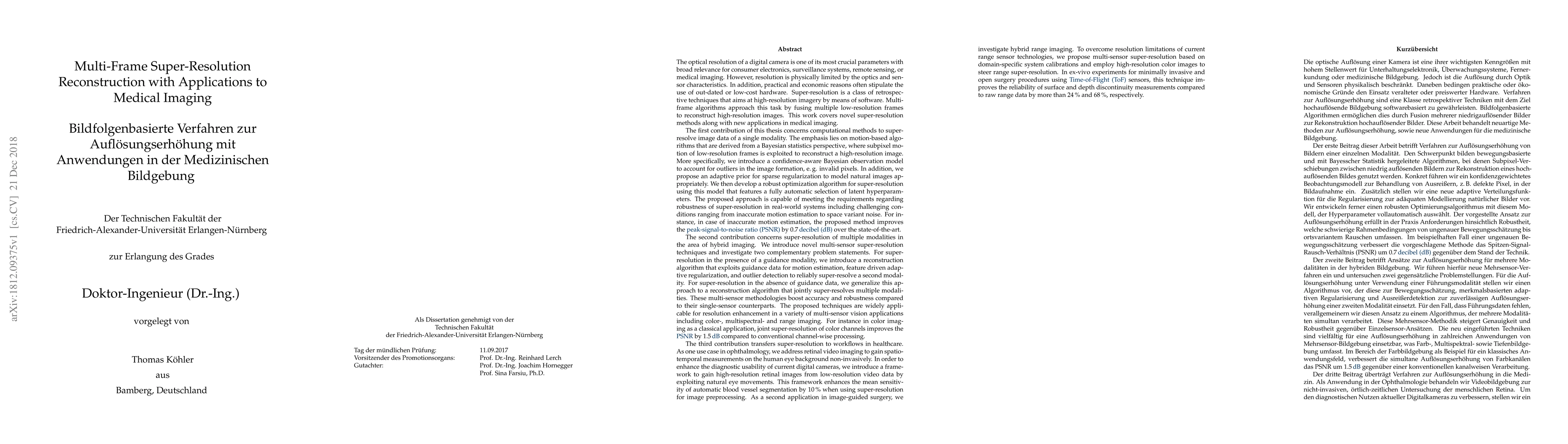 The optical resolution of a digital camera is one of its most crucial parameters with broad relevance for consumer electronics, surveillance systems, remote sensing, or medical imaging. However, resolution is physically limited by the optics and sensor characteristics. In addition, practical and economic reasons often stipulate the use of out-dated or low-cost hardware. Super-resolution is a class of retrospective techniques that aims at high-resolution imagery by means of software. Multi-frame algorithms approach this task by fusing multiple low-resolution frames to reconstruct high-resolution images. This work covers novel super-resolution methods along with new applications in medical imaging.