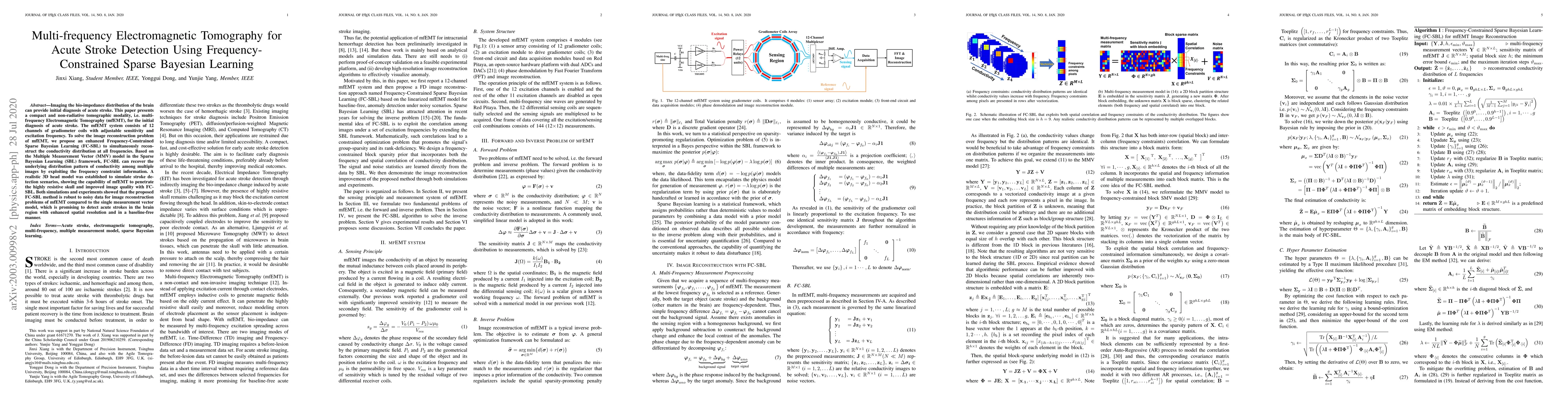 This paper introduces a multi-frequency Electromagnetic Tomography (mfEMT) system for acute stroke detection, utilizing Frequency-Constrained Sparse Bayesian Learning (FC-SBL) to reconstruct bio-impedance distributions. The proposed method demonstrates improved image quality and robustness to noisy data, showing promise in detecting strokes with enhanced spatial resolution.