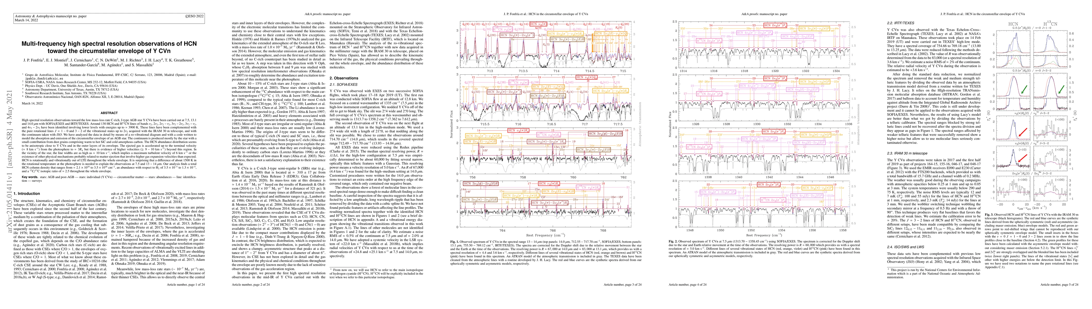 High spectral resolution observations toward the low mass-loss rate C-rich, J-type AGB star Y CVn have been carried out at 7.5, 13.1 and 14.0 um with SOFIA/EXES and IRTF/TEXES. Around 130 HCN and H13CN lines of bands v2, 2v2, 2v2-v2, 3v2-2v2, 3v2-v2, and 4v2-2v2 have been identified involving lower levels with energies up to ~3900 K. These lines have been complemented with the pure rotational lines J=1-0 and 3-2 of the vibrational states up to 2v2 acquired with the IRAM 30 m telescope, and with the continuum taken with ISO. We have analyzed the data with a ro-vibrational diagram and a code which models the absorption and emission of the circumstellar envelope of an AGB star. The continuum is produced by the star with a small contribution from dust grains comprising warm to hot SiC and cold amorphous carbon. The HCN abundance distribution seems to be anisotropic. The ejected gas is accelerated up to the terminal velocity (~8 km/s) from the photosphere to ~3R* but there is evidence of higher velocities (>9-10 km/s) beyond this region. In the vicinity of Y CVn, the line widths are as high as ~10 km/s, which implies a maximum turbulent velocity of 6 km/s or the existence of other physical mechanisms probably related to matter ejection that involve higher gas expansion velocities than expected. HCN is rotationally and vibrationally out of LTE throughout the whole envelope. A difference of about 1500 K in the rotational temperature at the photosphere is needed to explain the observations at 7.5 and 13-14 um. Our analysis finds a total HCN column density that ranges from ~2.1E+18 to 3.5E+18 cm^{-2}, an abundance with respect to H2 of 3.5E-05 to 1.3E-04, and a 12C/13C isotopic ratio of ~2.5 throughout the whole envelope.