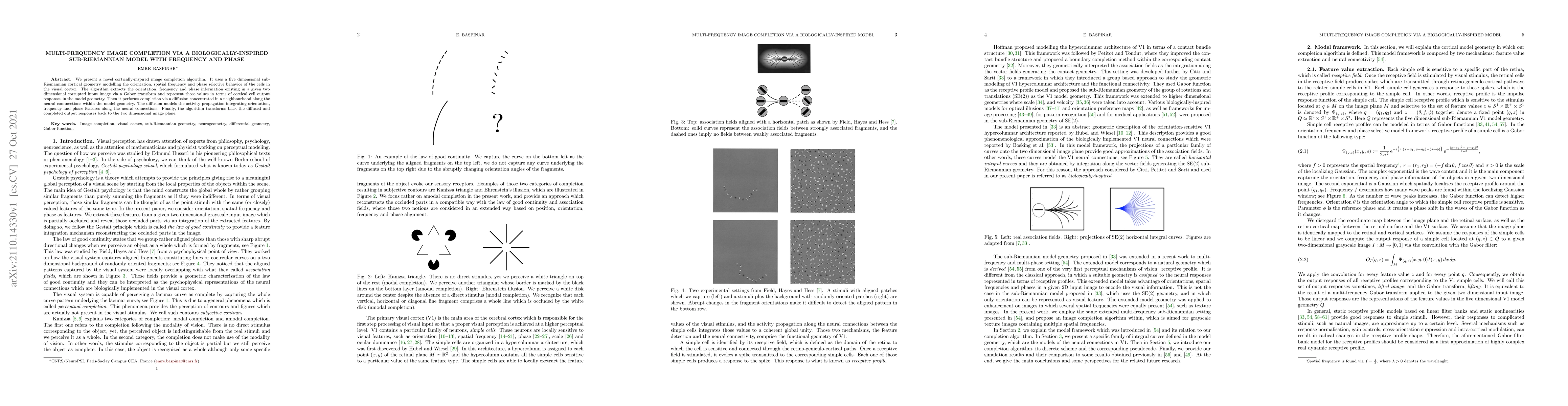 This research introduces a cortically-inspired image completion algorithm that models the visual cortex using a five-dimensional sub-Riemannian geometry, integrating orientation, spatial frequency, and phase. It uses a Gabor transform to extract and represent image features in the model, then completes the image via diffusion along neural connections, and finally transforms the results back to the image plane.