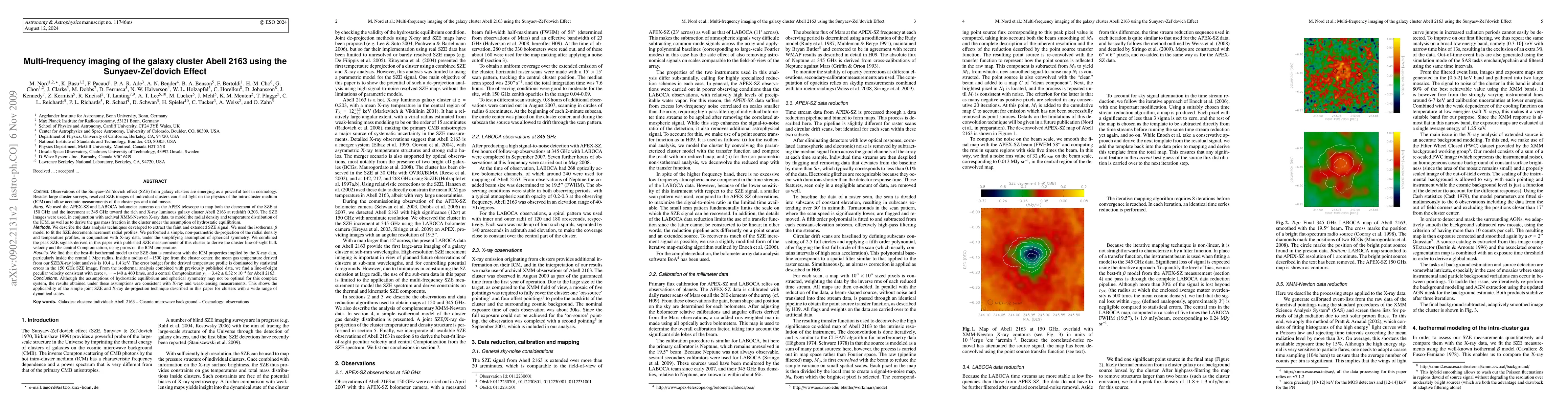 We used the APEX-SZ and LABOCA bolometer cameras on the APEX telescope to map the decrement of the Sunyaev-Zeldovich effect at 150 GHz and the increment at 345 GHz toward the galaxy cluster Abell 2163. The SZE images were used to model the radial density and temperature distribution of the ICM, and to derive the gas mass fraction in the cluster under the assumption of hydrostatic equilibrium. We used the isothermal beta model to fit the SZE decrement/increment radial profiles. We performed a simple, non-parametric de-projection of the radial density and temperature profiles, in conjunction with XMM-Newton X-ray data, under the simplifying assumption of spherical symmetry. We combined the peak SZE signals derived in this paper with published SZE measurements of this cluster to derive the cluster line-of-sight bulk velocity and the central Comptonization, using priors on the ICM temperature. We find that the best-fit isothermal model to the SZE data is consistent with the ICM properties implied by the X-ray data, particularly inside the central 1 Mpc radius. Although the assumptions of hydrostatic equilibrium and spherical symmetry may not be optimal for this complex system, the results obtained under these assumptions are consistent with X-ray and weak-lensing measurements. This shows the applicability of the simple joint SZE and X-ray de-projection technique described in this paper for clusters with a wide range of dynamical states. (Abridged)