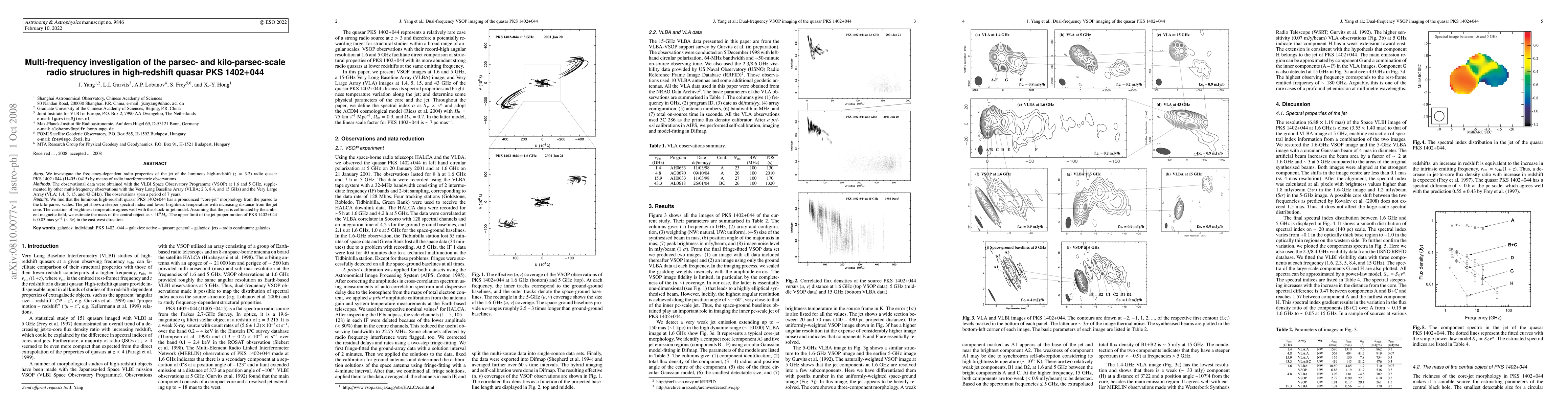 This paper investigates the radio properties of the high-redshift quasar PKS 1402+044 using multi-frequency observations from 1.4 to 43 GHz. The study reveals a pronounced "core-jet" morphology and supports the shock-in-jet model, estimating the central object's mass at ~10^9 M_sun.