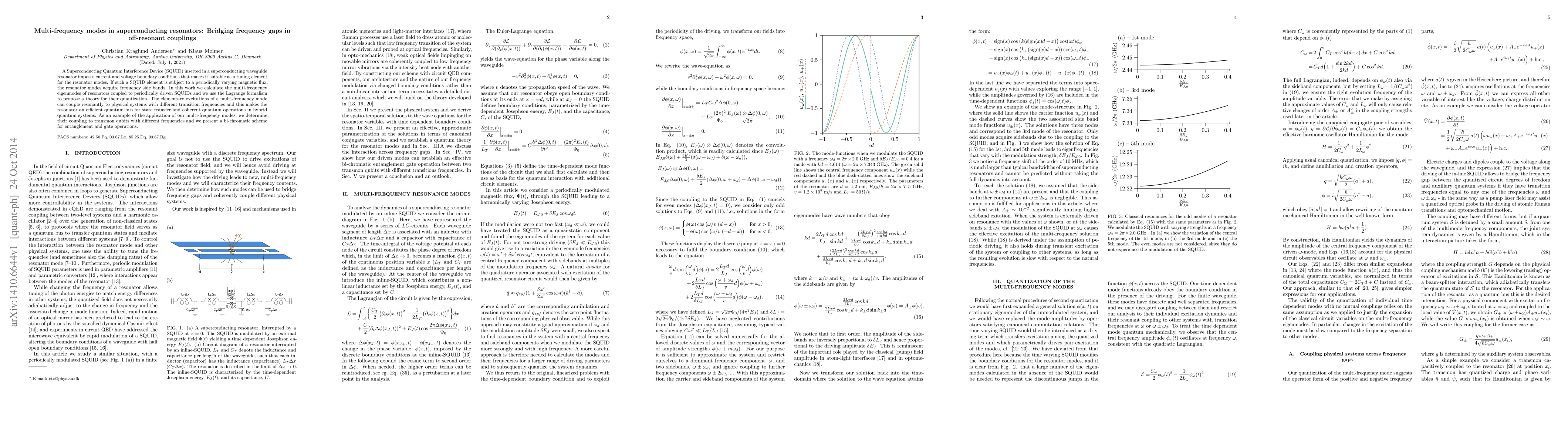 A Superconducting Quantum Interference Device (SQUID) inserted in a superconducting waveguide resonator imposes current and voltage boundary conditions that makes it suitable as a tuning element for the resonator modes. If such a SQUID element is subject to a periodically varying magnetic flux, the resonator modes acquire frequency side bands. In this work we calculate the multi-frequency eigenmodes of resonators coupled to periodically driven SQUIDs and we use the Lagrange formalism to propose a theory for their quantization. The elementary excitations of a multi-frequency mode can couple resonantly to physical systems with different transition frequencies and this makes the resonator an efficient quantum bus for state transfer and coherent quantum operations in hybrid quantum systems. As an example of the application of our multi-frequency modes, we determine their coupling to transmon qubits with different frequencies and we present a bi-chromatic scheme for entanglement and gate operations.