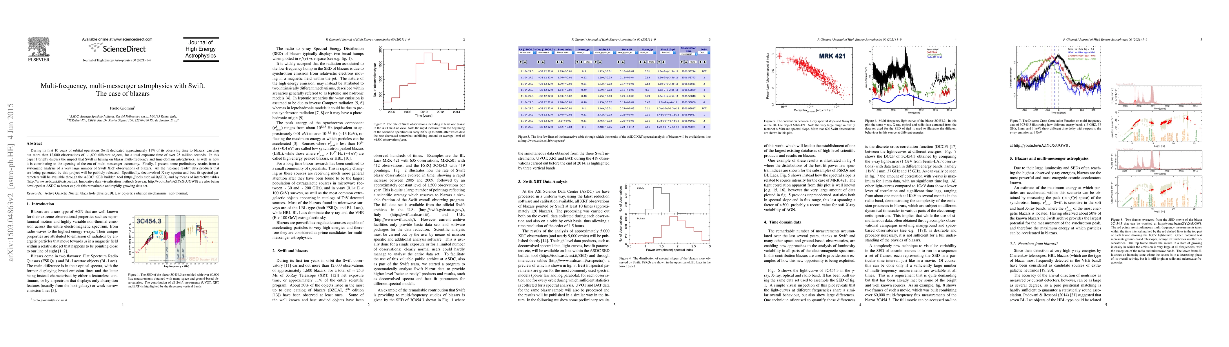This paper discusses Swift's significant contributions to blazar multi-frequency and time-domain astrophysics over its first 10 years, highlighting its role in advancing multi-messenger astronomy. It also presents preliminary results from extensive Swift XRT observations and outlines the public release of "science ready" data products.