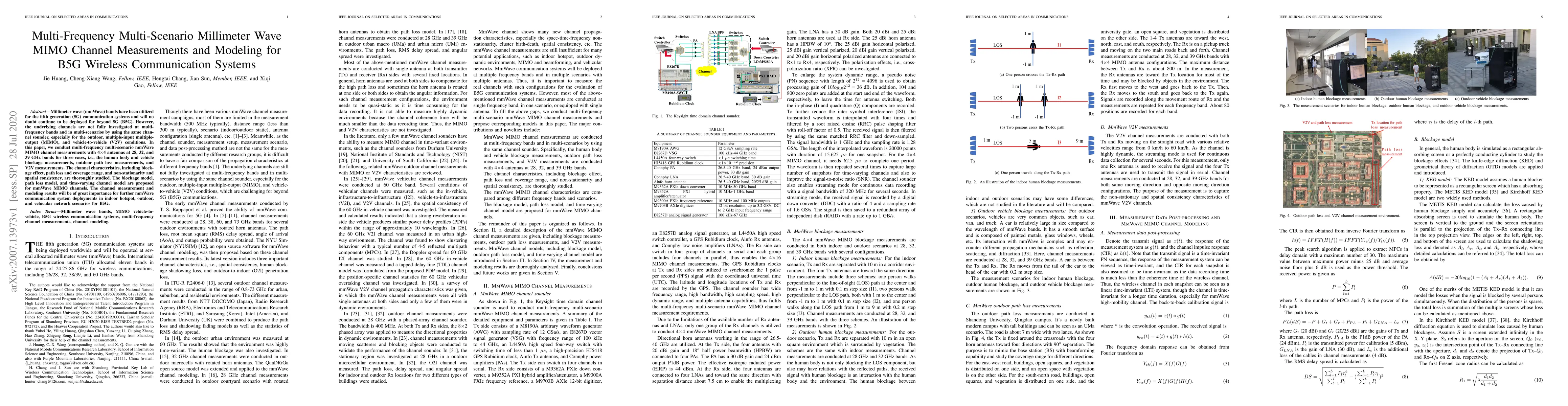 Extends previous research by providing comprehensive multi-frequency and multi-scenario mmWave MIMO channel measurements and modeling, including human body and vehicle blockage, outdoor path loss, and V2V conditions.