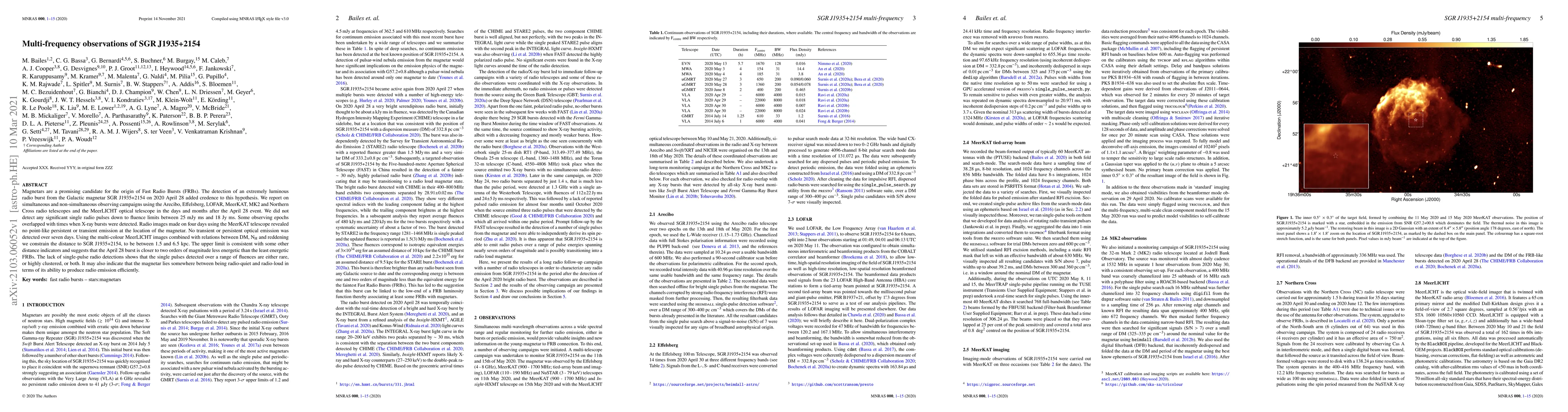 This study reports on multi-frequency observations of the magnetar SGR J1935+2154 following its detection of a luminous radio burst in April 2020, finding no significant single radio pulses or persistent/transient radio or optical emissions, suggesting the magnetar's radio emission is rare or clustered, and placing its distance between 1.5 and 6.5 kpc.