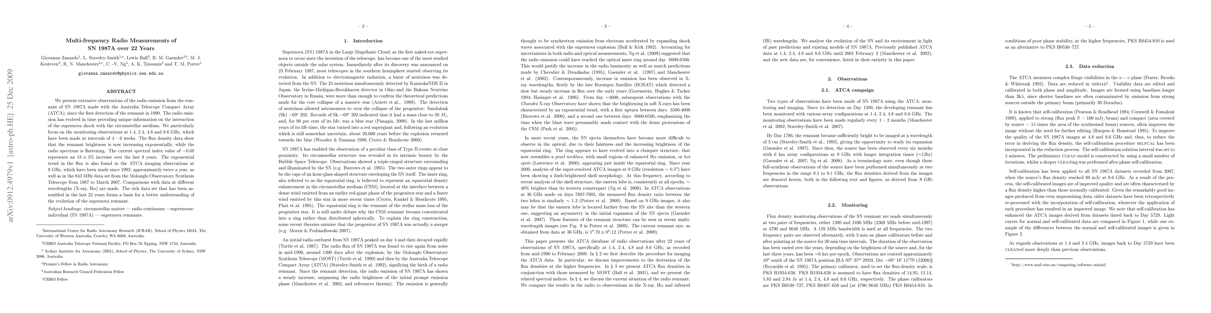 Extensive multi-frequency radio measurements of SN 1987A were conducted over 22 years using the Australia Telescope Compact Array (ATCA) at frequencies 1.4, 2.4, 4.8, and 8.6 GHz, with additional observations at 9 GHz and 843 MHz from the Molonglo Observatory Synthesis Telescope. Monitoring was done at intervals of 4-6 weeks.
