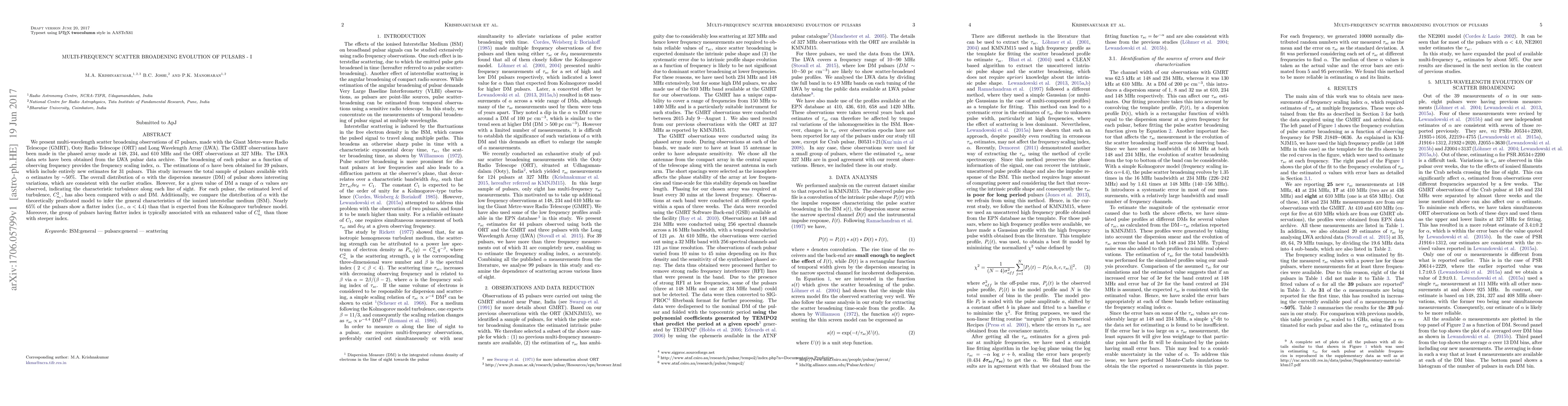 The paper presents a comprehensive analysis of scatter broadening evolution across multiple frequencies, providing new α estimates and comparing them with theoretical models.