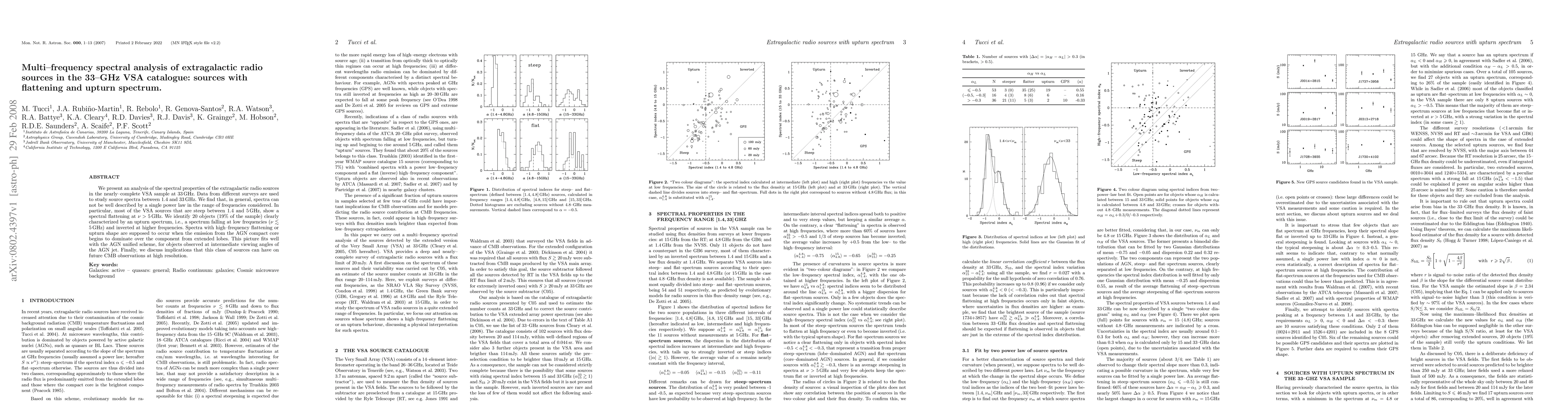 We present an analysis of the spectral properties of the extragalactic radio sources in the nearly-complete VSA sample at 33GHz. Data from different surveys are used to study source spectra between 1.4 and 33GHz. We find that, in general, spectra can not be well described by a single power law in the range of frequencies considered. In particular, most of the VSA sources that are steep between 1.4 and 5GHz, show a spectral flattening at \nu>5GHz. We identify 20 objects (19% of the sample) clearly characterized by an upturn spectrum, i.e., a spectrum falling at low frequencies (\nu<5GHz) and inverted at higher frequencies. Spectra with high-frequency flattening or upturn shape are supposed to occur when the emission from the AGN compact core begins to dominate over the component from extended lobes. This picture fits well with the AGN unified scheme, for objects observed at intermediate viewing angles of the AGN jet. Finally, we discuss implications that this class of sources can have on future CMB observations at high resolution.