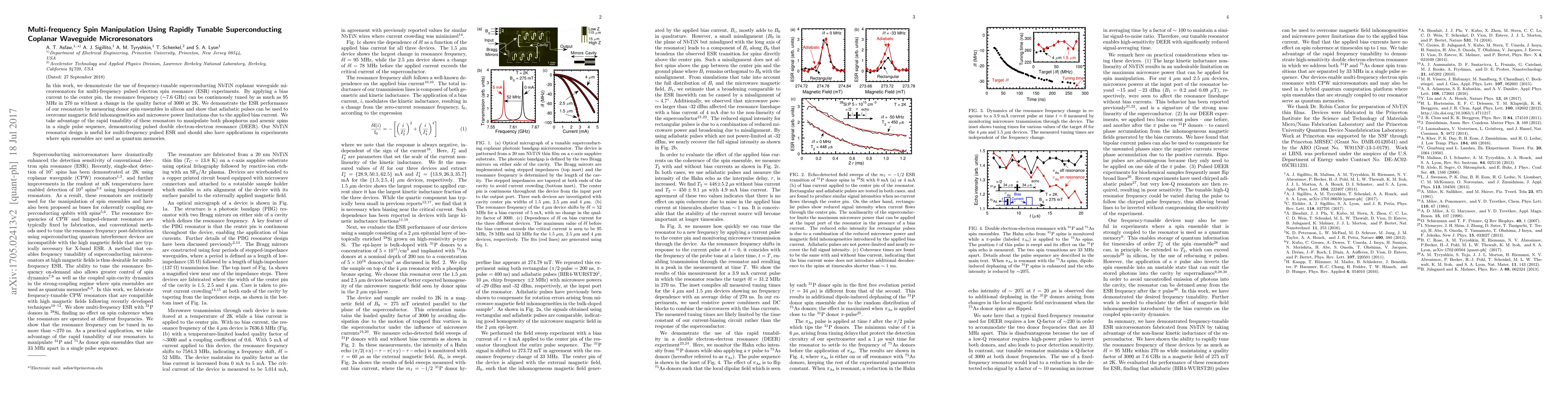 This paper presents frequency-tunable superconducting NbTiN coplanar waveguide microresonators for multi-frequency pulsed electron spin resonance, achieving continuous tuning of 95 MHz in 270 ns without degrading quality factor. The resonators enable efficient manipulation of phosphorus and arsenic spins in pulsed double electron-electron resonance experiments.