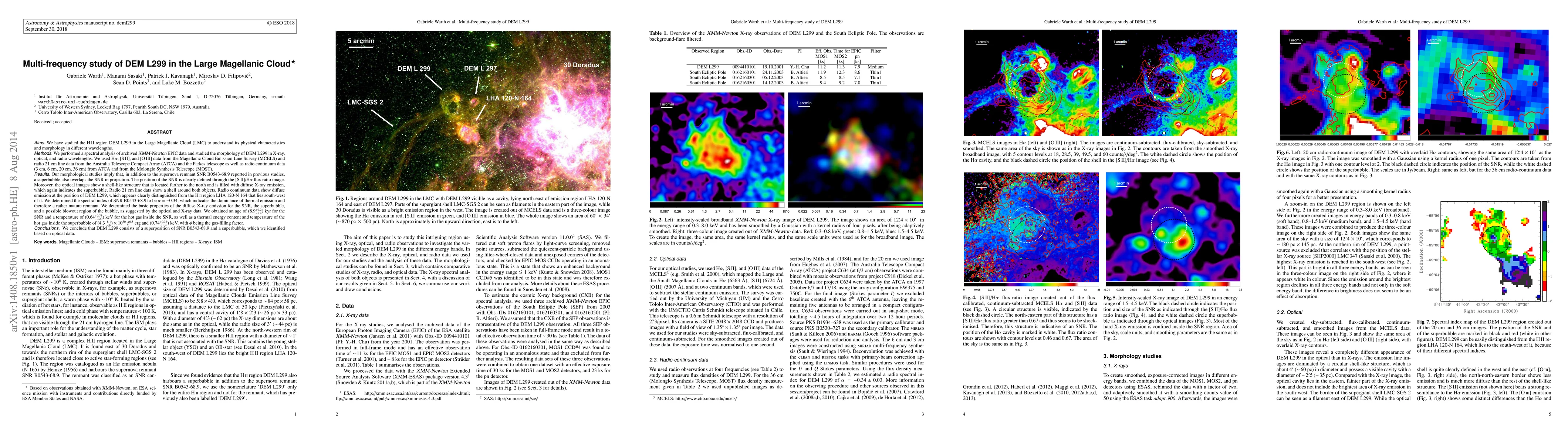 We have studied the HII region DEM L299 in the Large Magellanic Cloud to understand its physical characteristics and morphology in different wavelengths. We performed a spectral analysis of archived XMM-Newton EPIC data and studied the morphology of DEM L299 in X-ray, optical, and radio wavelengths. We used H alpha, [SII], and [OIII] data from the Magellanic Cloud Emission Line Survey and radio 21 cm line data from the Australia Telescope Compact Array (ATCA) and the Parkes telescope, and radio continuum data from ATCA and the Molonglo Synthesis Telescope. Our morphological studies imply that, in addition to the supernova remnant SNR B0543-68.9 reported in previous studies, a superbubble also overlaps the SNR in projection. The position of the SNR is clearly defined through the [SII]/H alpha flux ratio image. Moreover, the optical images show a shell-like structure that is located farther to the north and is filled with diffuse X-ray emission, which again indicates the superbubble. Radio 21 cm line data show a shell around both objects. Radio continuum data show diffuse emission at the position of DEM L299, which appears clearly distinguished from the HII region N 164 that lies south-west of it. We determined the spectral index of SNR B0543-68.9 to be alpha=-0.34, which indicates the dominance of thermal emission and therefore a rather mature SNR. We determined the basic properties of the diffuse X-ray emission for the SNR, the superbubble, and a possible blowout region of the bubble, as suggested by the optical and X-ray data. We obtained an age of 8.9 (3.5-18.1) kyr for the SNR and a temperature of 0.64 (0.44-1.37) keV for the hot gas inside the SNR, and a temperature of the hot gas inside the superbubble of 0.74 (0.44-1.1) keV. We conclude that DEM L299 consists of a superposition of SNR B0543-68.9 and a superbubble, which we identified based on optical data.