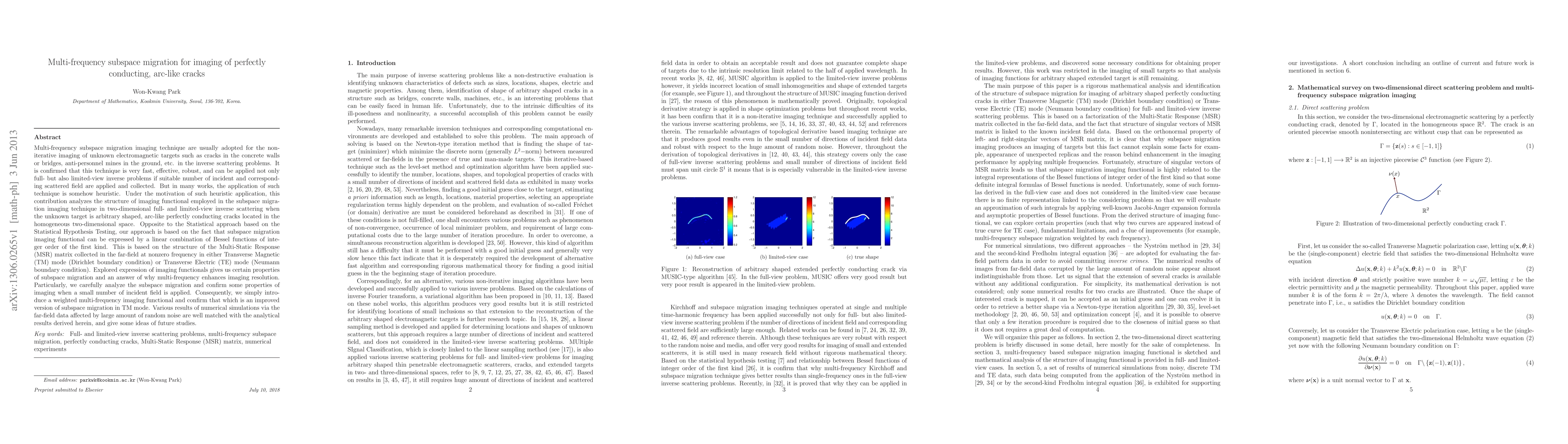 Multi-frequency subspace migration imaging technique are usually adopted for the non-iterative imaging of unknown electromagnetic targets such as cracks in the concrete walls or bridges, anti-personnel mines in the ground, etc. in the inverse scattering problems. It is confirmed that this technique is very fast, effective, robust, and can be applied not only full- but also limited-view inverse problems if suitable number of incident and corresponding scattered field are applied and collected. But in many works, the application of such technique is somehow heuristic. Under the motivation of such heuristic application, this contribution analyzes the structure of imaging functional employed in the subspace migration imaging technique in two-dimensional inverse scattering when the unknown target is arbitrary shaped, arc-like perfectly conducting cracks located in the homogeneous two-dimensional space. Opposite to the Statistical approach based on the Statistical Hypothesis Testing, our approach is based on the fact that subspace migration imaging functional can be expressed by a linear combination of Bessel functions of integer order of the first kind. This is based on the structure of the Multi-Static Response (MSR) matrix collected in the far-field at nonzero frequency in either Transverse Magnetic (TM) mode or Transverse Electric (TE) mode. Explored expression of imaging functionals gives us certain properties of subspace migration and an answer of why multi-frequency enhances imaging resolution. Particularly, we carefully analyze the subspace migration and confirm some properties of imaging when a small number of incident field is applied. Consequently, we simply introduce a weighted multi-frequency imaging functional and confirm that which is an improved version of subspace migration in TM mode.